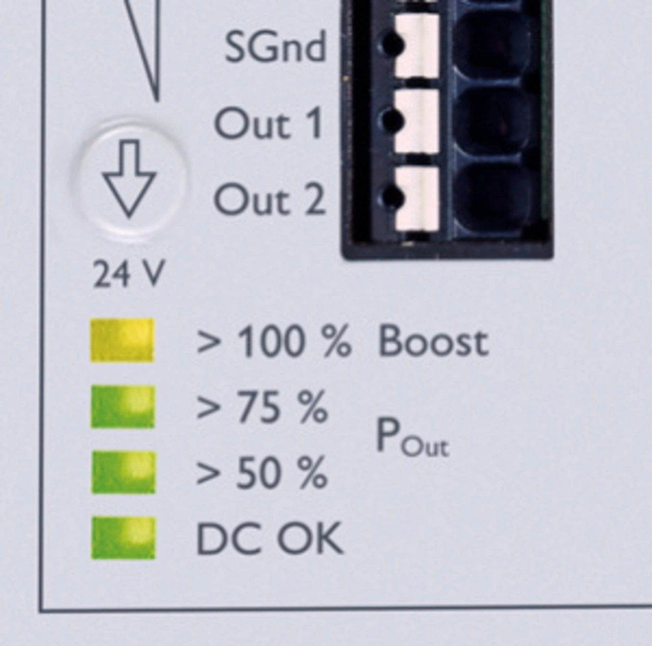 Für eine maximale Anlagenverfügbarkeit ist die präventive Funktionsüberwachung zur Ferndiagnose des Netzteils sinnvoll. Durch die permanente Überwachung von Ausgangsspannung und -strom werden kritische Situationen über den frontseitig integrierten LED-Bargraph visualisiert und dem potenzialfreien Relaiskontakt sowie dem aktiven Signalausgang der Steuerung gemeldet, bevor ein Problem auftritt. Liefert die Stromversorgung mehr als den angegebenen Nennstrom, befindet sie sich im Boost-Betrieb.