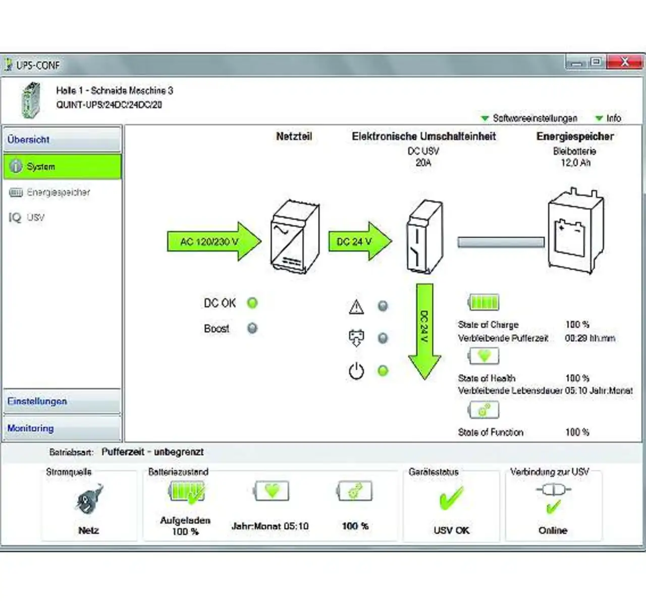 Über die Software UPS-Conf kann sich der Anwender zudem die Werte »State of Charge« (SOC), »State of Health« (SOH) und »State of Function« (SOF) darstellen lassen. Diese Angaben informieren über den aktuellen Ladezustand des Energiespeichers und die verbleibende Restlaufzeit sowie die verbleibende Lebenserwartung und die gegenwärtige Leistungsfähigkeit der Batterie.