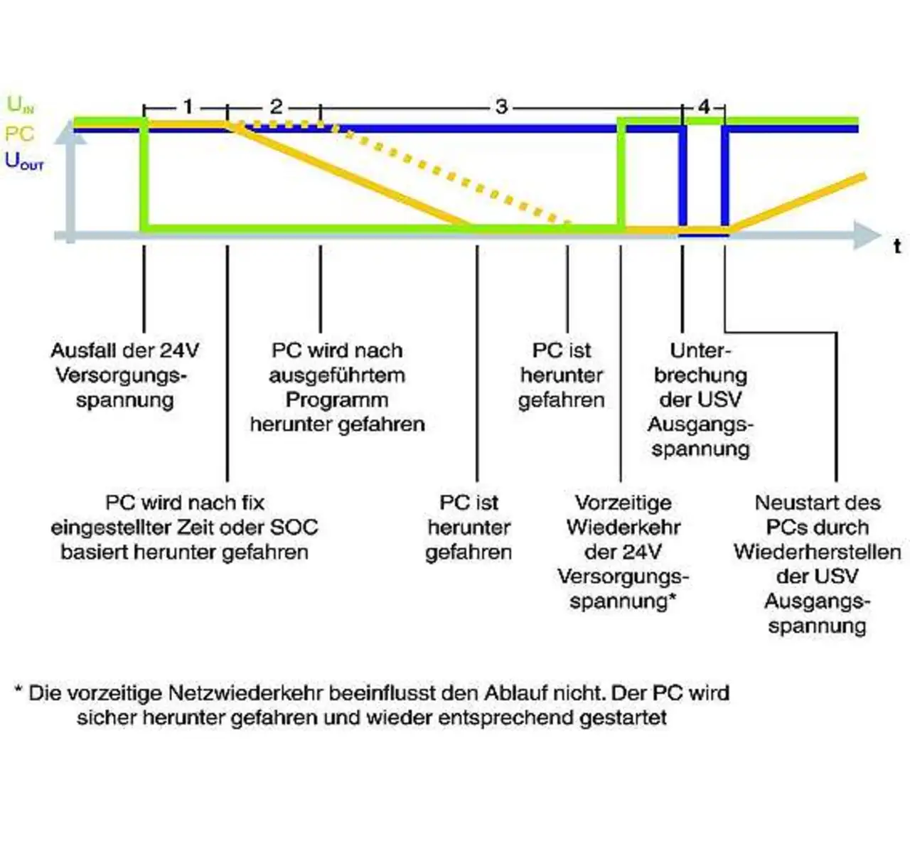 Bevor die Batteriespannung dann einbricht, fährt der Industrie-PC kontrolliert herunter. In der Einstellung »PC-Mode« am Drehwahlschalter der Quint UPS-IQ folgt die USV-Funktion einer zeitlichen Abfolge, die sich über die Software parametrieren und damit individuell für die jeweilige Applikation optimieren lässt (Bild 3). Der Ablauf unterscheidet vier aufeinander folgende Aktionen:
