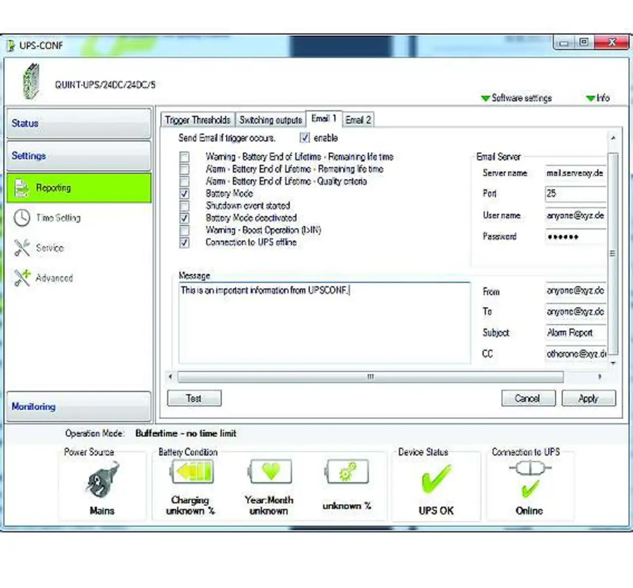Die konfigurierbaren Meldungen können auf die Schaltausgänge der Quint UPS-IQ gelegt werden. Alternativ lässt sich direkt aus der Software eine E-Mail versenden (Bild 4). In diesem Fall erhält der Planer der Service-Einsätze eine Warnmeldung, während die Alarmierung sofort den Servicetechniker erreicht.
