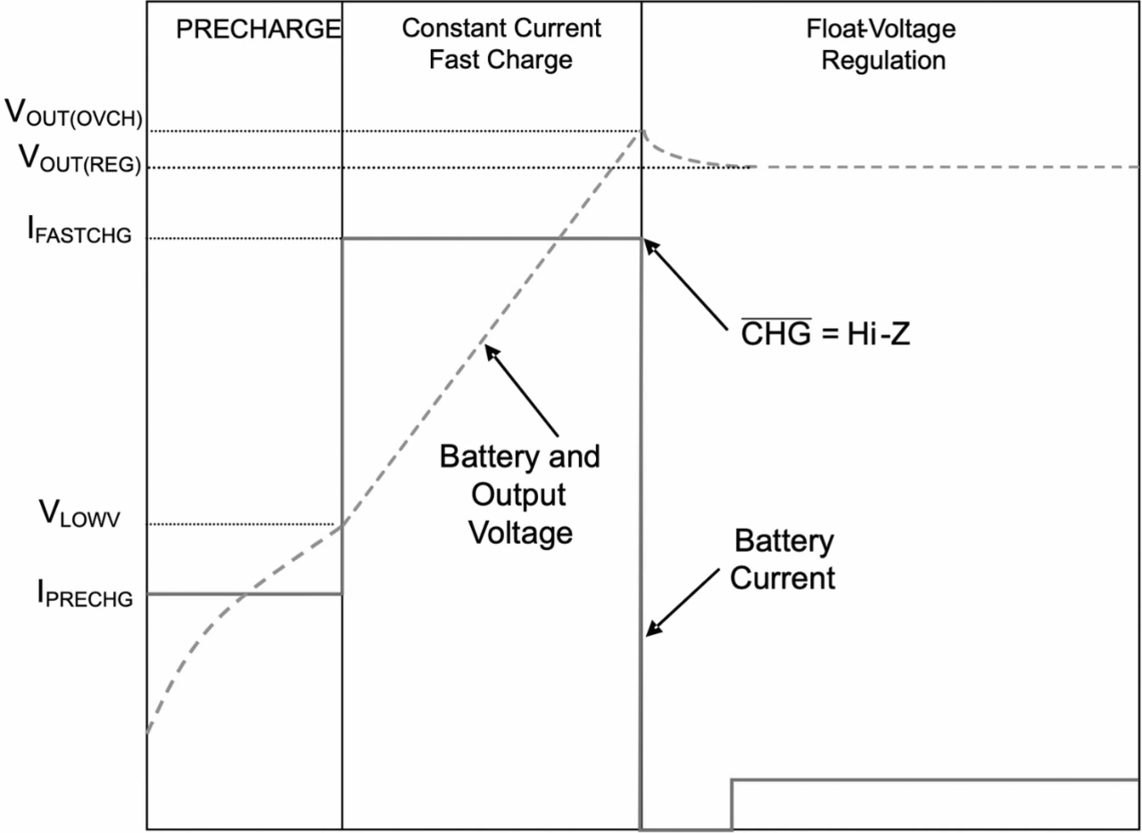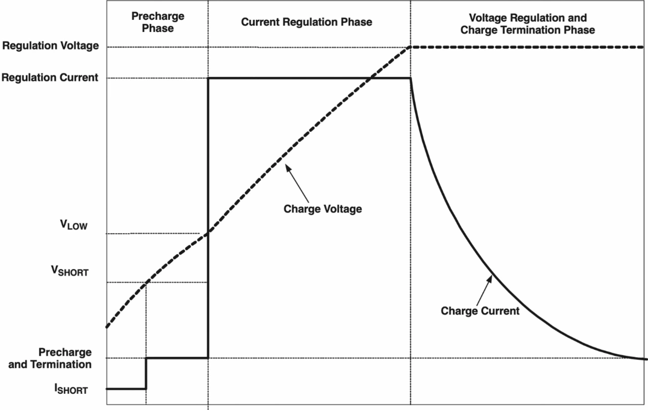In Bild 3 und Bild 4, die hier mit freundlicher Genehmigung von Texas Instruments verwendet werden, sind die Unterschiede zwischen einem typischen Li-Ionen- und einem LiFePO4-Ladeprofil dargestellt. So erfordert der Ladealgorithmus für LiFePO4-Zellen (Bild 4) nicht die für den Ladezyklus von Lithium-Ionen-Batterien typische konstante Spannung (CV) (Bild 3).