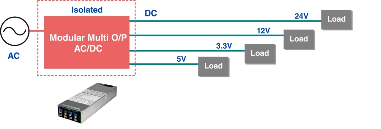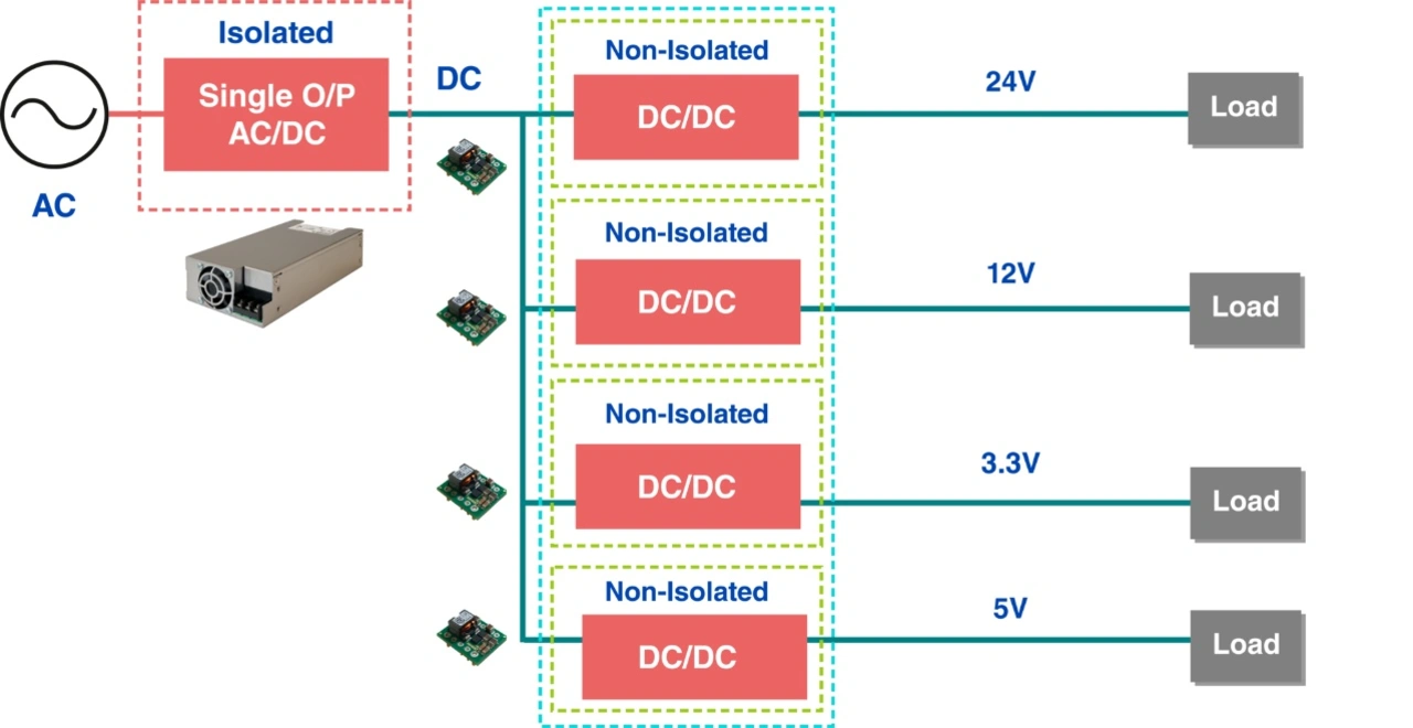 Bei der verteilten Stromversorgungsarchitektur (Distributed Power Architecture, DPA) wird ein Ansatz für die Entwicklung von Stromversorgungen verfolgt, bei dem der AC-DC Wandlungsprozess von der DC-DC Wandlung näher am Lastpunkt getrennt wird (siehe Abbildung 2). Diese Methode kann für Entwicklungsingenieure eine Reihe von Vorteilen bieten, insbesondere dann, wenn nur ein wenig zusätzliche Ausgänge benötigt werden. Wie jede Entscheidung für ein Design bringt jedoch auch DPA eine Reihe von Vor- und Nachteilen mit sich.