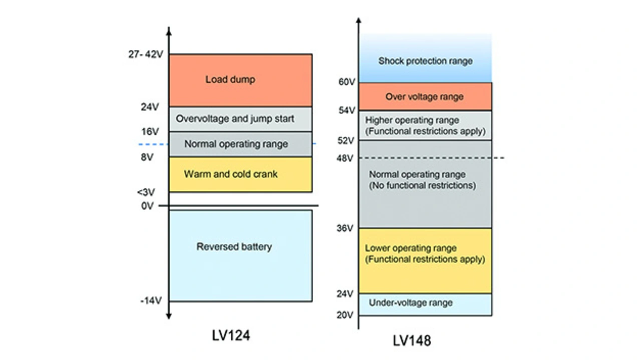 Der Standard LV124, auch als VW80000 bekannt, definiert die Werte für Systeme mit 12-V-Nennspannung, und der Standard LV148 gilt für Systeme mit 48 V, wie sie in Hybrid-Elektrofahrzeugen (HEVs) üblich sind (Bild 2). Dabei handelt es sich um Spannungen aus Quellen mit hoher Leistung. Zudem sind auch Transienten hoher Spannung mit beiden Polaritäten, aber geringerer Leistung, verfügbar. Die Standards ISO-7637-2 und ISO 16750-2 sind für Stromversorgungsleitungen anwendbar.