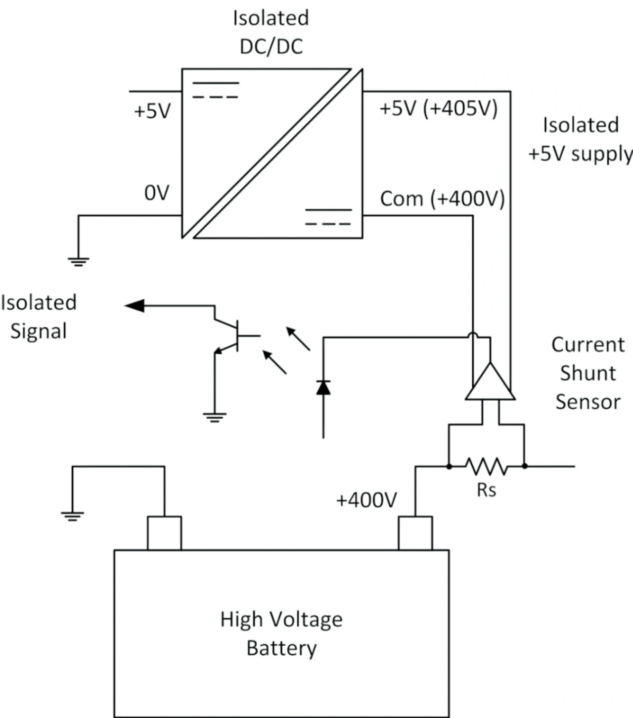 5 V für einen CAN-Bus-Datentrenner zu erzeugen ist eine typische Anwendung des Bauteils. Die Isolationseinstufung des SMT-Wandlers ist 5 kV DC/1s (2,8 kV AC/1min) mit >4 mm Kriechstrecke. Eine weitere wesentliche Anwendung ist die Versorgung von High-Side-Stromsensoren in den Batterie-Managementsystemen in Elektrofahrzeugen (Bild 5). Dort hat die Sensorschaltung einen Offset von der Systemerdung um die 400-V-Batteriespannung, aber benötigt lokal 5 V, die isoliert sein müssen, sodass der Ausgang auf den Sensor bezogen werden kann.