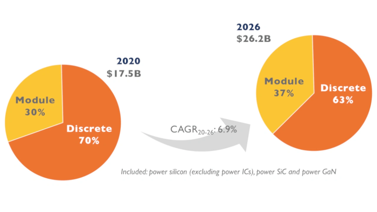 Verschiedene Applikationstrends begünstigen sowohl diskrete Bauelemente als auch Module, was zu einem soliden Marktwachstum für diese beiden Segmente führt: IGBT- und SiC-Power-Module werden hauptsächlich in Anwendungen wie Elektromobilität, Windturbinen, Fotovoltaik, Batterie-Stromspeicher (BESS) und DC-Ladegeräte für Elektrofahrzeuge eingesetzt, vor allem aufgrund des Trends zu höheren Systemleistungen. Auf der anderen Seite finden diskrete Leistungskomponenten vor allem in Anwendungen mit geringem Strombedarf Verwendung, z. B. in kleinen Motorantrieben, Mikrowechselrichtern bzw. String-Wechselrichtern für PV-Anlagen in Wohngebäuden, Nebenaggregaten für Kraftfahrzeuge, DC-DC-Wandlern und On-Board-Ladegeräten in Elektrofahrzeugen usw.
