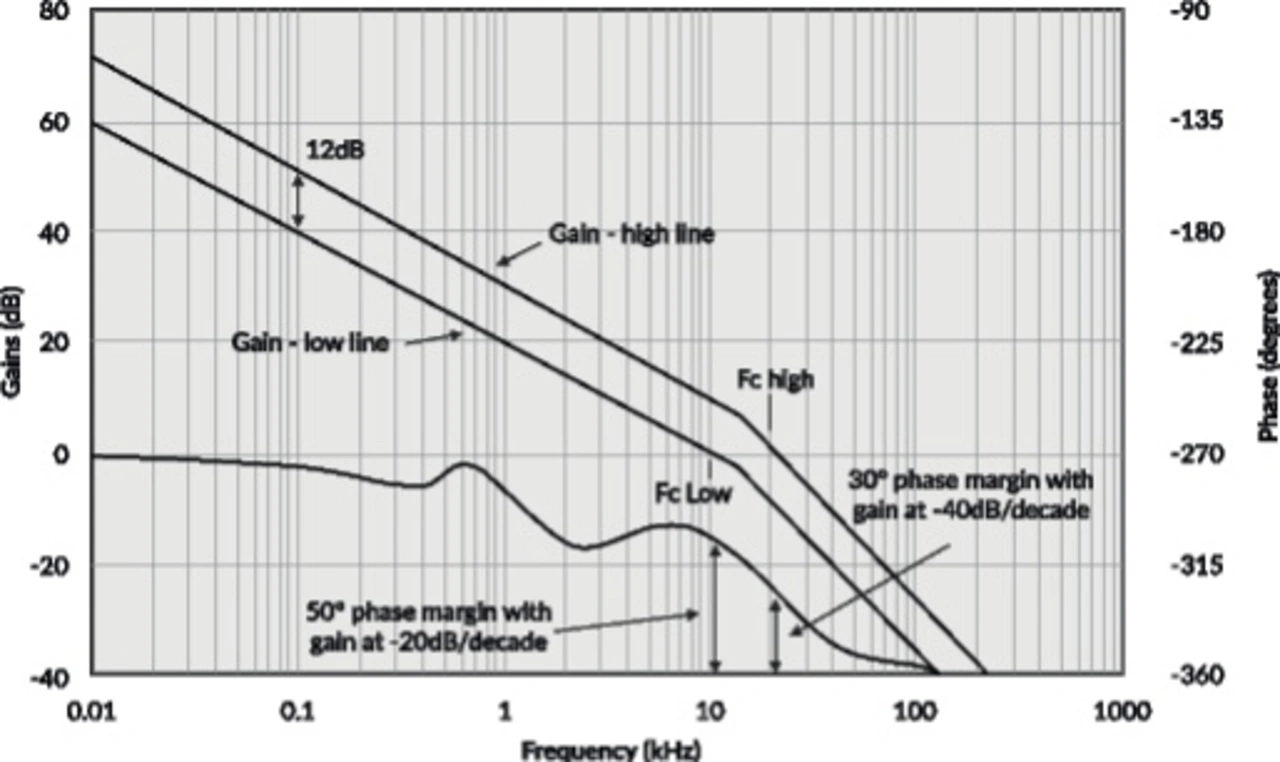 Während die digitale Steuerung nahezu beliebig genaue Kompensationseigenschaften ermöglicht, kann die analoge Steuerung bei geringerer Komplexität tatsächlich eine völlig ausreichende Leistung liefern, allerdings nur unter einer bestimmten Bedingung. Ändert sich die Schaltungstopologie, etwa der Laststrom oder der Ersatzserienwiderstand (ESR) des Ausgangskondensators, der sich mit der Temperatur ändert, so sind die optimalen Werte der Kompensationsbausteine je nach Schaltungstopologie unterschiedlich. Ebenso weisen diskrete Kompensationsbausteine Toleranzen auf und können mit zunehmendem Alter driften, sodass in einem professionellen Design die Amplituden- und Phasenreserven erhöht werden müssen, um solch ungünstigste Situationen abzufedern. Zur Veranschaulichung zeigt Bild 3 den Amplituden- und Phasengang eines Abwärtswandler-Regelkreises mit einer 4:1- oder 12-dB-Variation der Eingangsspannung.