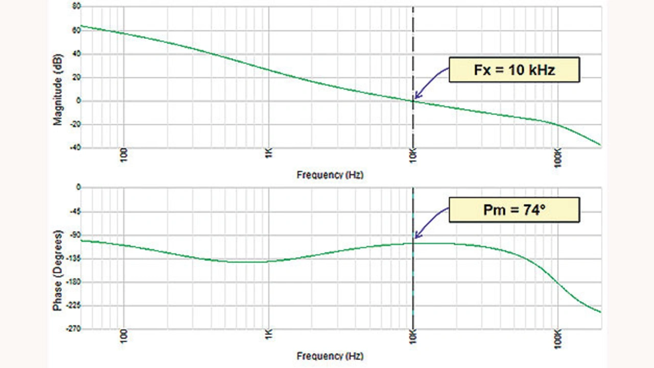 Bild 3 zeigt das Bode-Diagramm des PCMR-Tiefsetzstellers. Bei niedrigen Frequenzen ist die DC-Verstärkung ersichtlich. Es existiert eine niederfrequente reale Polstelle, eine ESR-Nullstelle und ein komplex konjugiertes Polstellenpaar bei halber Schaltfrequenz. Dieser Kurvenverlauf ist für alle hart schaltenden Eintaktflusswandler ähnlich. Zwar unterscheiden sich die niederfrequente Polstelle und die ESR-Nullstelle der Regelstrecke, das komplex konjugierte Polstellenpaar wird jedoch immer bei der halben Schaltfrequenz zu finden sein.