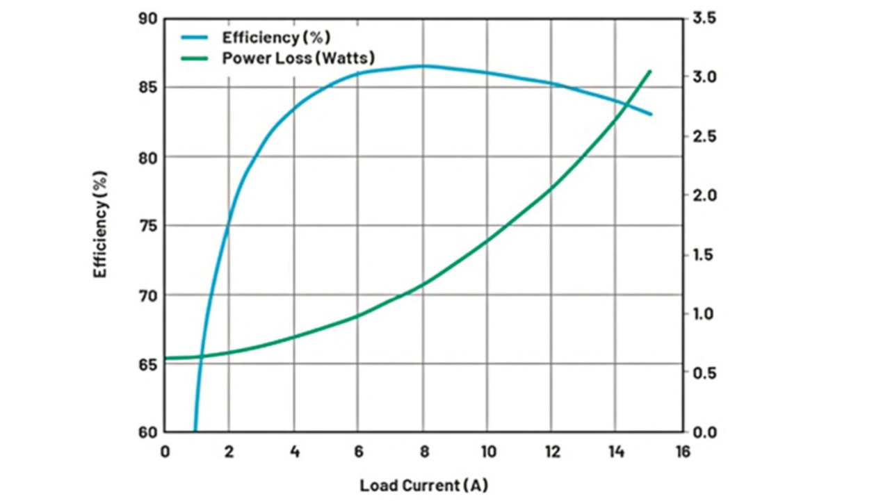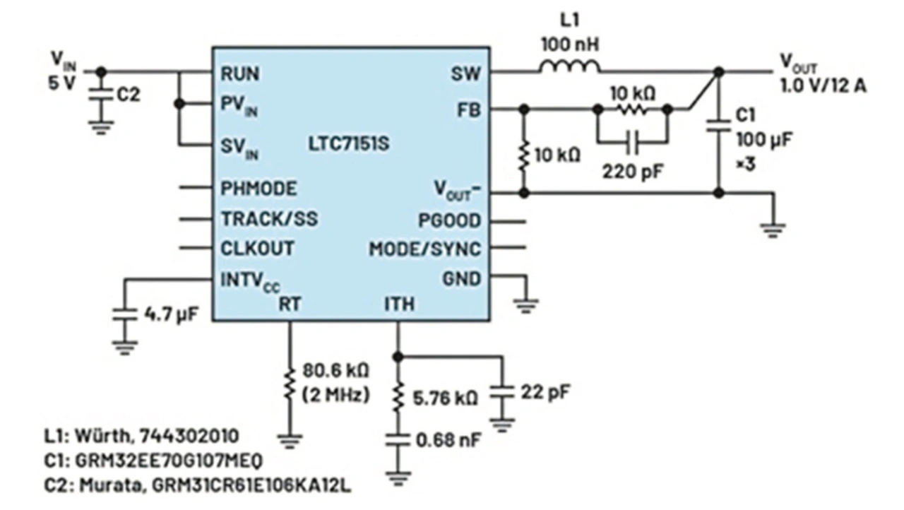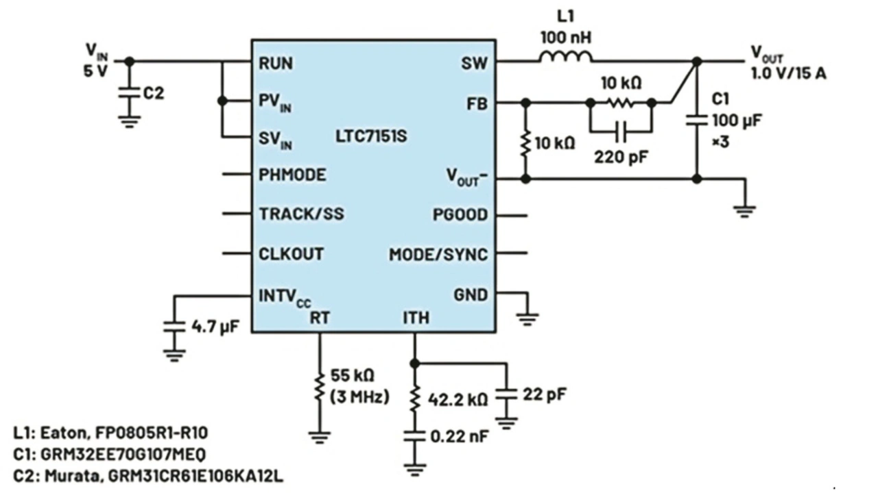 Wie bereits erwähnt, erlaubt die minimale Einschaltzeit des oberen Schalters von typisch 20 ns einen Betrieb mit sehr geringem Tastverhältnis bei hoher Schaltfrequenz. Entwickler können den Baustein daher mit sehr hohen Frequenzen von beispielsweise 3 MHz betreiben, um die Werte (und damit die Abmessungen) der Induktivität und der Eingangs- und Ausgangskondensatoren zu verringern. Platzintensive Kühlkomponenten wie etwa Lüfter oder Kühlkörper sind bei Verwendung des LTC7151S nicht nötig, da der Baustein auch bei sehr hohen Schaltfrequenzen sehr effizient arbeitet.