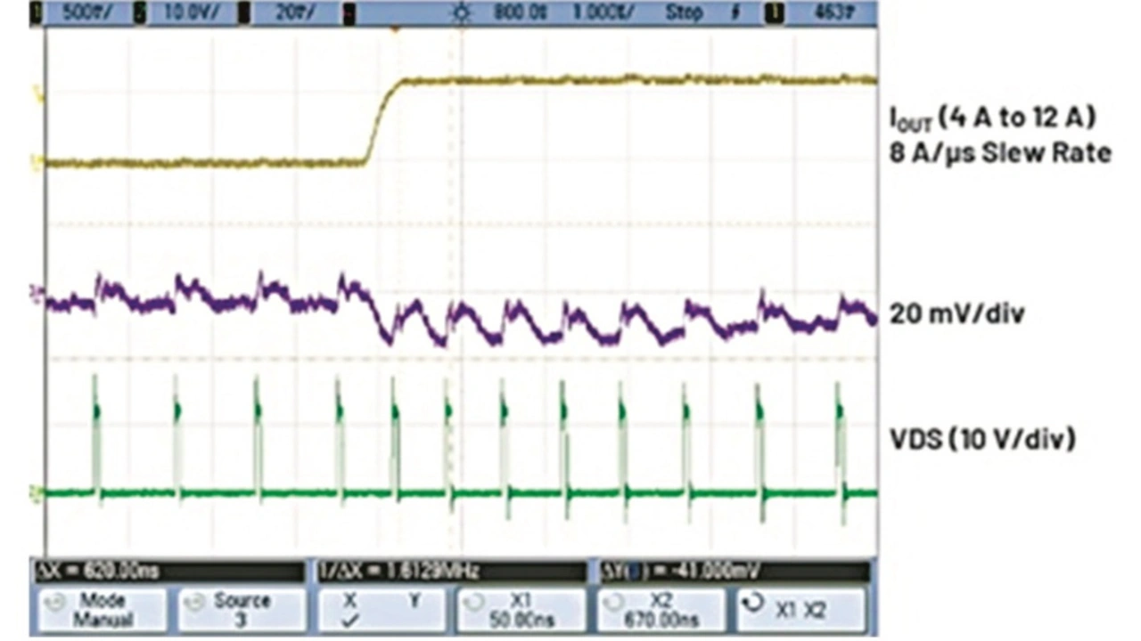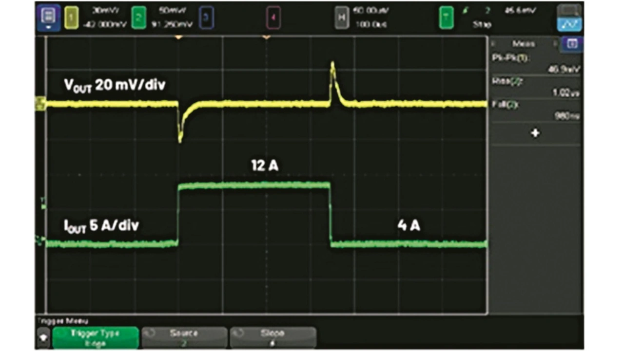 In den Bildern 4 und 5 ist das Verhalten des LTC7151S bei einem Lastsprung zu sehen, bei dem sich der Laststrom mit einer Anstiegsgeschwindigkeit von 8 A/µs von 4 A auf 12 A ändert. Die COT-Valley-Current-Regelung (Controlled On-Time) komprimiert die Impulse am Schaltknoten während des Lastsprungs. Schon etwa 1 µs nach Beginn der steigenden Flanke fängt die Ausgangsspannung an sich zu regenerieren, wobei die Über- und Unterschwinger auf 46 mV (Peak-to-Peak) begrenzt werden. Die in Bild 3 gezeigten drei Keramikkondensatoren von je 100 µF reichen aus, um die typischen Spezifikationen für einen Lastsprung zu erfüllen. In Bild 5 sind die typischen Schalt-Signalverläufe während eines Lastsprungs zu sehen.