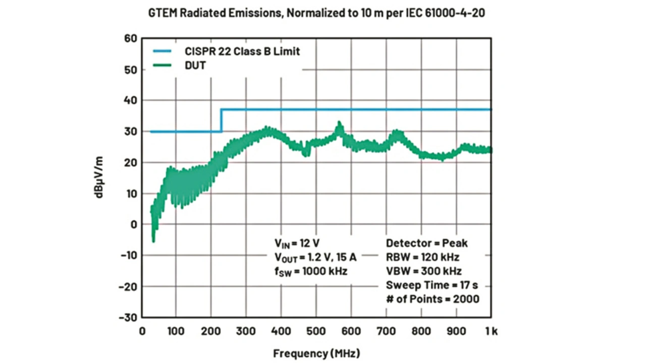 Der LTC7151S wurde in einer EMI-Prüfkammer getestet und erfüllte mit einem einfachen vorgeschalteten EMI-Filter die Grenzwerte gemäß CISPR 22/CISPR 32 für leitungsgebundene und abgestrahlte Störgrößen. Bild 8 zeigt den Schaltplan einer 1-MHz-Schaltung mit 1,2 V/15 A, während Bild 9 das EMI-Testergebnis für CISPR 22 in einer GTEM-Zelle (Gigahertz Transveral Electromagnetic) wiedergibt.