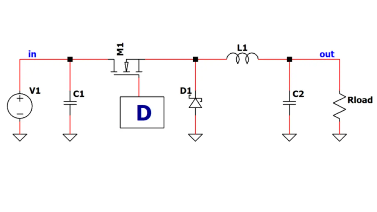 Der PWM-Block D wird durch die potenzialfreie Versorgung V2 implementiert, da die Gate-Spannung höher als die Source-Spannung sein muss, damit der N-Kanal-MOSFET M1 leitet. Dabei erzeugt V2 Impulse von 0 V bis 5 V, die vom Zeitpunkt t = 0 der Simulation schaltet, in 5 ns auf 5 V steigt bzw. abfällt und eine Einschaltzeit (Ton) von 0,55 µs erreicht, während der voller Schaltzyklus Tp 2 µs ist.