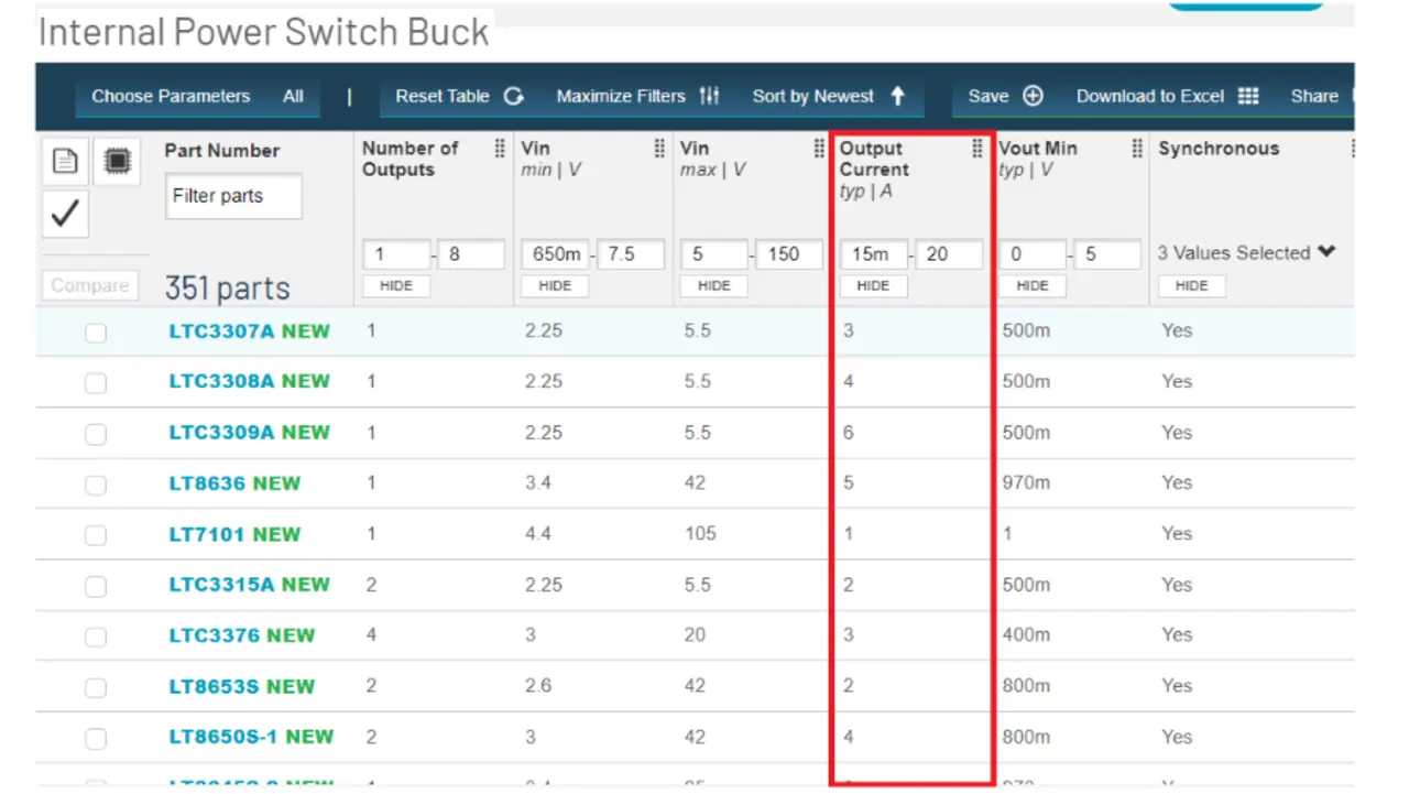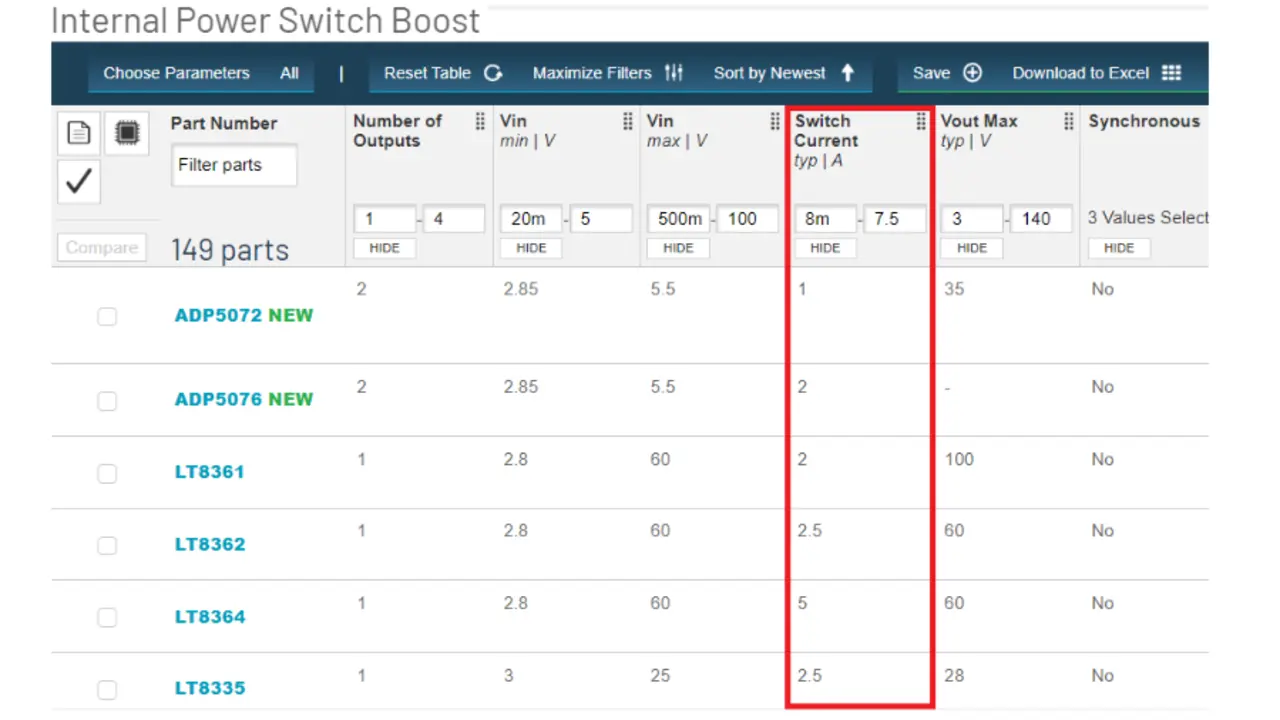 Den ersten Hinweis auf unterschiedliche Auswahlprozesse gibt die Auswahltabelle verschiedener ICs. Bild 1 listet sind die verschiedenen Parameter auf, die für die Wahl eines Tiefsetzstellers mit integrierten Leistungsschaltern zur Verfügung stehen. Daraus wird ersichtlich, ist der Ausgangsstrom einer der Auswahlparameter. In der Auswahltabelle (Bild 2) der Hochsetzsteller mit integrierten Leistungsschaltern ist nicht der Ausgangsstrom, sondern der Schaltstrom angegeben.