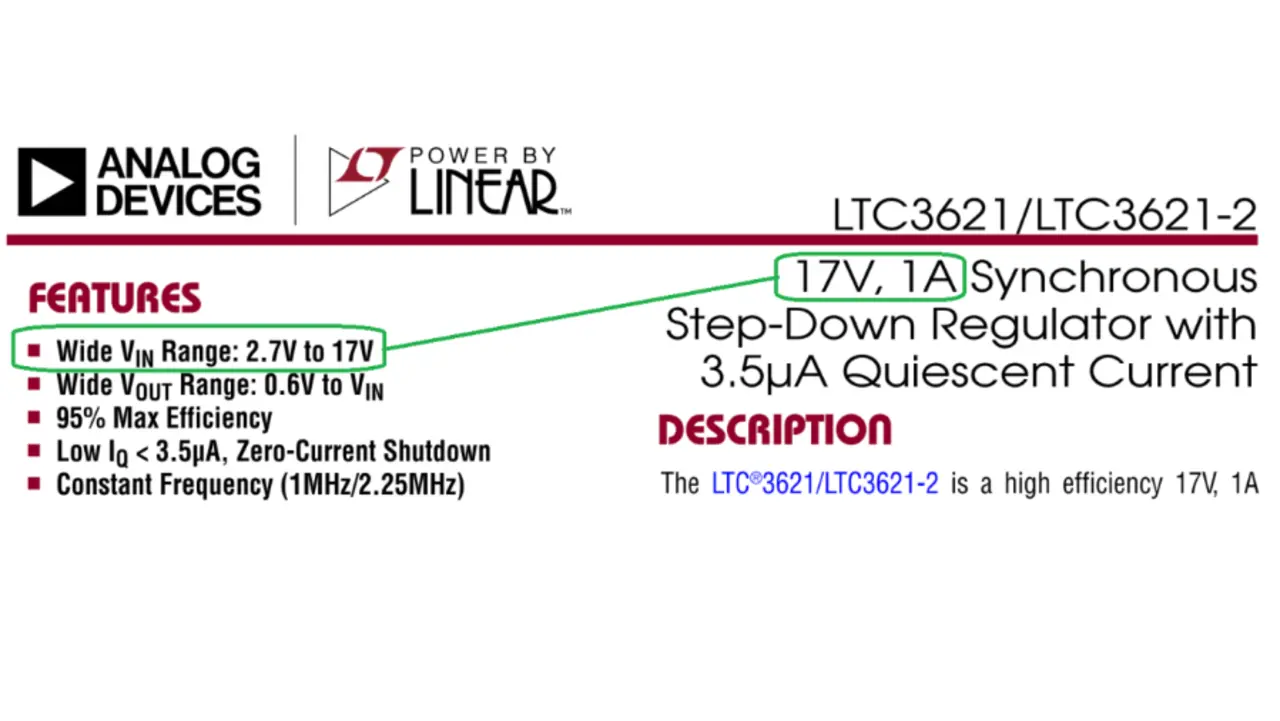 Auch das Datenblatt macht auf der ersten Seite unterschiedliche Angaben (Bild 3). Das Datenblatt des Abwärtsreglers LTC3621 gibt zum Beispiel eine maximale Eingangsspannung Uin von 17 V an und besagt, dass das Bauteil einen Strom von 1 A kontinuierlich liefern kann.