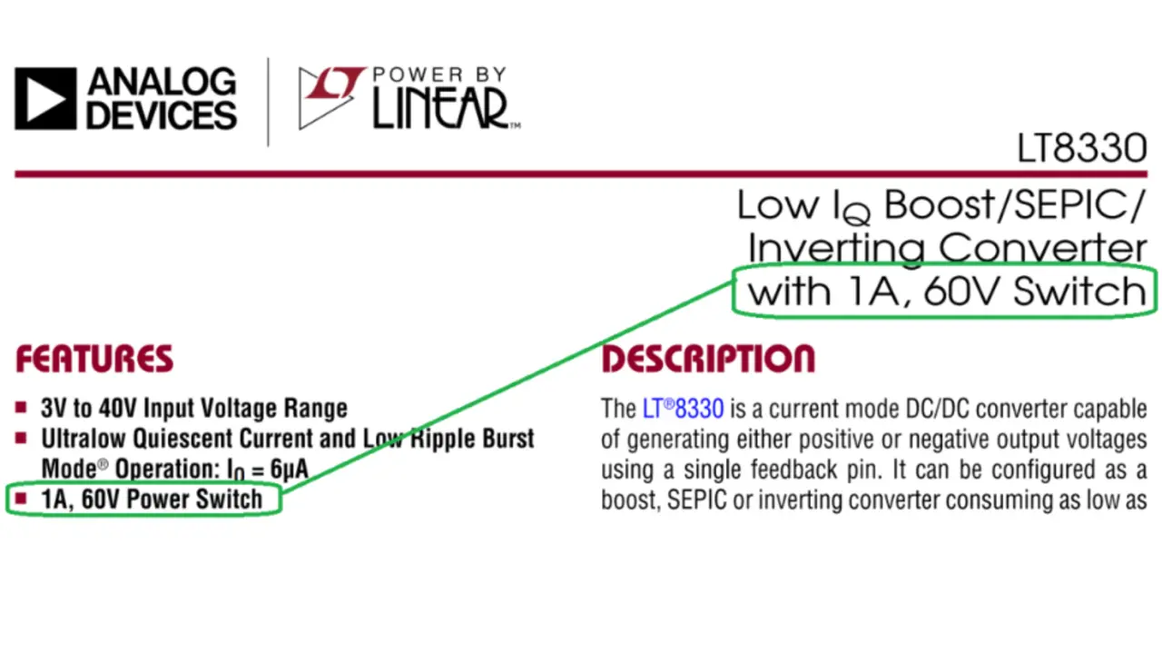 Das Datenblatt für den Aufwärtswandler LT8330 (Bild 4) ist ähnlich aufgebaut. Allerdings werden dort die Spannung und der Strom des Schalters (des internen Leistungs-MOSFETs) und nicht die typischen Maximalwerte für Laststrom und Eingangsspannung angegeben. Auch auf dem Datenblatt des Aufwärtswandlers unterscheiden sich der Eingangsspannungsbereich von 3 V bis 40 V und die Schaltspannung von 60 V.