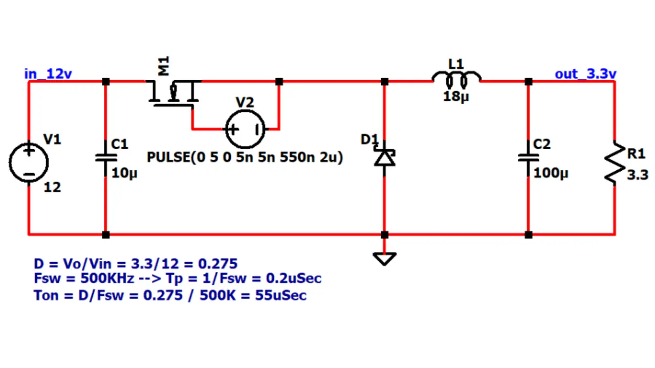 Mit LTspice lässt sich der Unterschied zwischen den Ein- und Ausgangsströmen der beiden unterschiedlichen Topologien deutlich erkennen. Bild 7 zeigt den Grundaufbau einer Open-Loop-Schaltung für einen Abwärtswandler, bei dem eine Eingangsspannung von 12 V in eine Ausgangsspannung von 3,3 V gewandelt wird, die einen Strom von 1 A an die ohmsche Last R1 liefert. Die Schaltung ist für 3,3 W ausgelegt.
