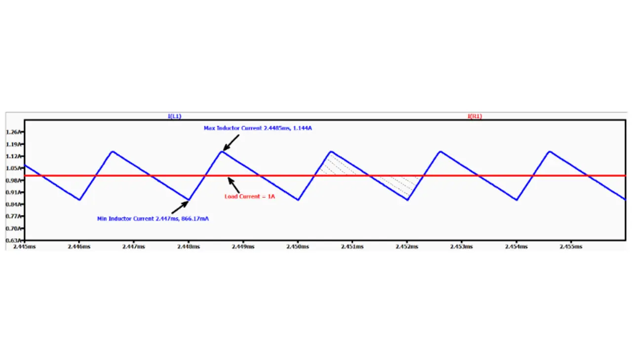 Sobald die Schaltung in Bild 7 simuliert ist, lassen sich die Ströme durch L1 und R1 prüfen. Der Strom durch L1 verläuft dreiecksförmig, da die Drosselspule durch das Schalten von M1 entsprechend des Timings von Ton – wenn M1 eingeschaltet ist – und Toff – wenn M1 ausgeschaltet ist – mit einer Frequenz von 500 kHz geladen und entladen wird. Ersichtlich ist, dass die Wellenform des Spulenstromes eine Wechsel- und eine Gleichstrom-Komponente hat. Der Strom geht von einem Minimalwert von 0,866 A (Ende von Toff) auf einen Maximalwert von 1,144 A (Ende von Ton) über.