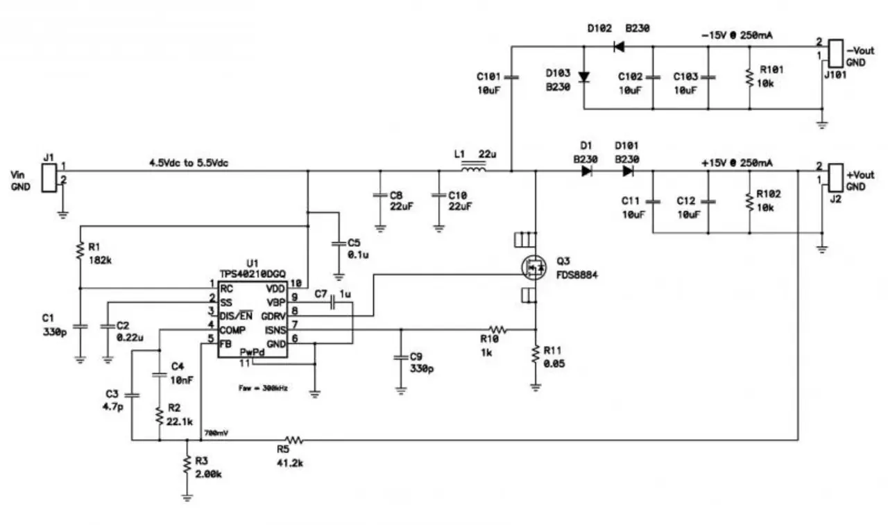 Oft werden negative und positive Spannungen benötigt, zum Beispiel Versorgungsspannungen für Operationsverstärker. Dieser Bericht zeigt eine Möglichkeit, aus 5 V Eingangsspannung +15 V und -15 V Ausgangspannung zu generieren. Beide Ausgänge können mit bis zu 250 mA belastet werden.