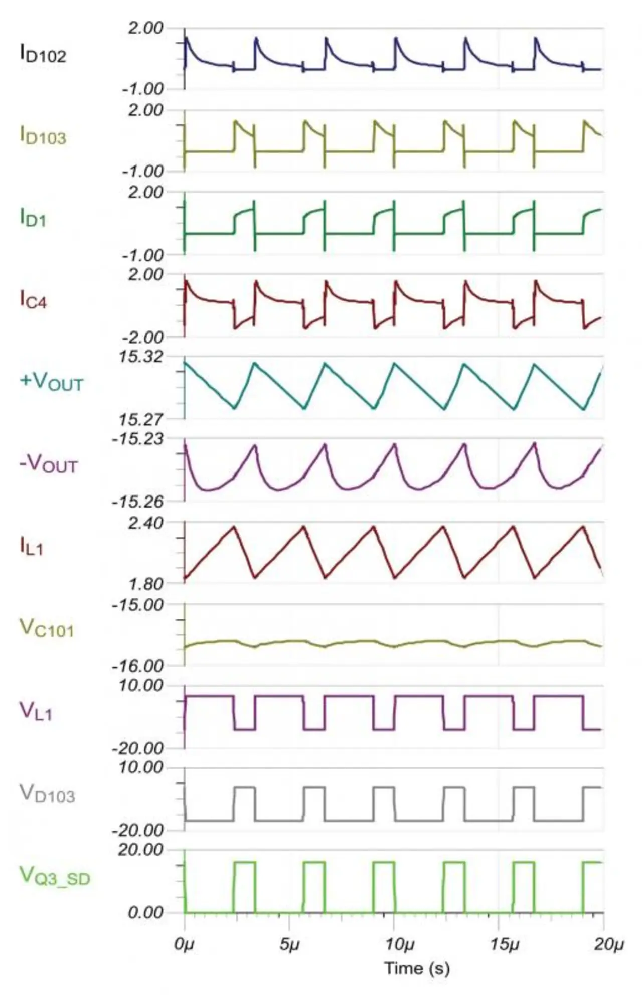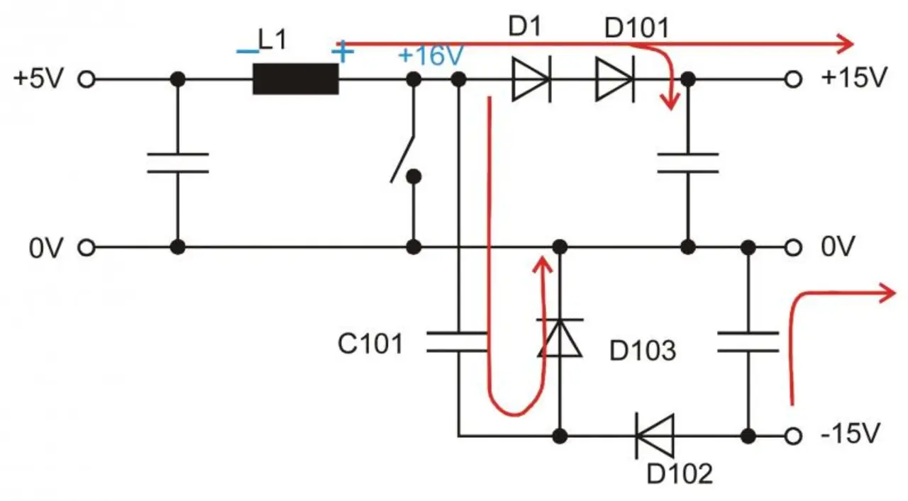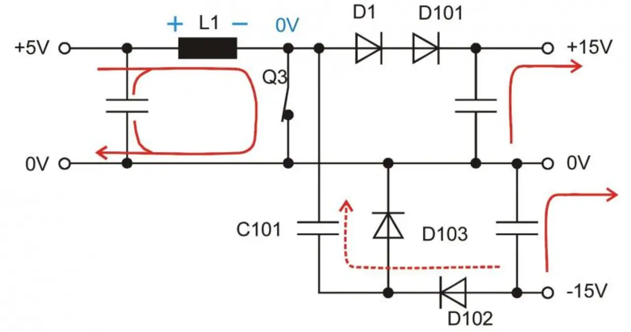 Wenn der Transistor Q3 wieder leitet, wird der Punkt zwischen Spule und Transistor schlagartig von 16 V auf 0 V heruntergezogen. Die Spannung am Kondensator C101 bleibt erhalten, und der Punkt zwischen C101 und den Dioden D103 und D102 verschiebt sich ebenfalls um zirka 16 V, sodass dort dann ebenfalls etwa -16 V anliegen.