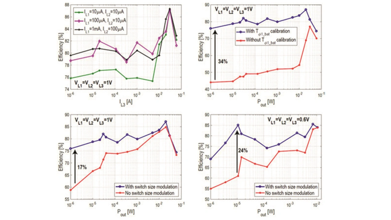 Der MISIMO-Chip ist 0,5 mm² groß und wurde in einer 28-nm-FDSOI-Technologie bei STMicroelectronics implementiert. Messungen zeigen einen maximalen Wirkungsgrad von 89 % und einen Wirkungsgrad von 75 % über alle Lasten und über einen Dynamikbereich von 1:60.000 (1 μW bis 60 mW) in L3 bei 1 V (Bild 4, oben links). Dies ist zum einen der ereignisgesteuerten dynamischen Regelung von tϕ_Hi, tϕ_BAT und fSW_Hi zu verdanken, die den Wirkungsgrad bei niedriger Last um bis zu 34 % verbessern (Bild 4, oben rechts). Zum anderen liegt dies an der dynamischen Switch-Size-Modulation bei 1 V bzw. 0,6 V, die den Wirkungsgrad um 17 % bis 24 % verbessert (Bild 4, unten).
