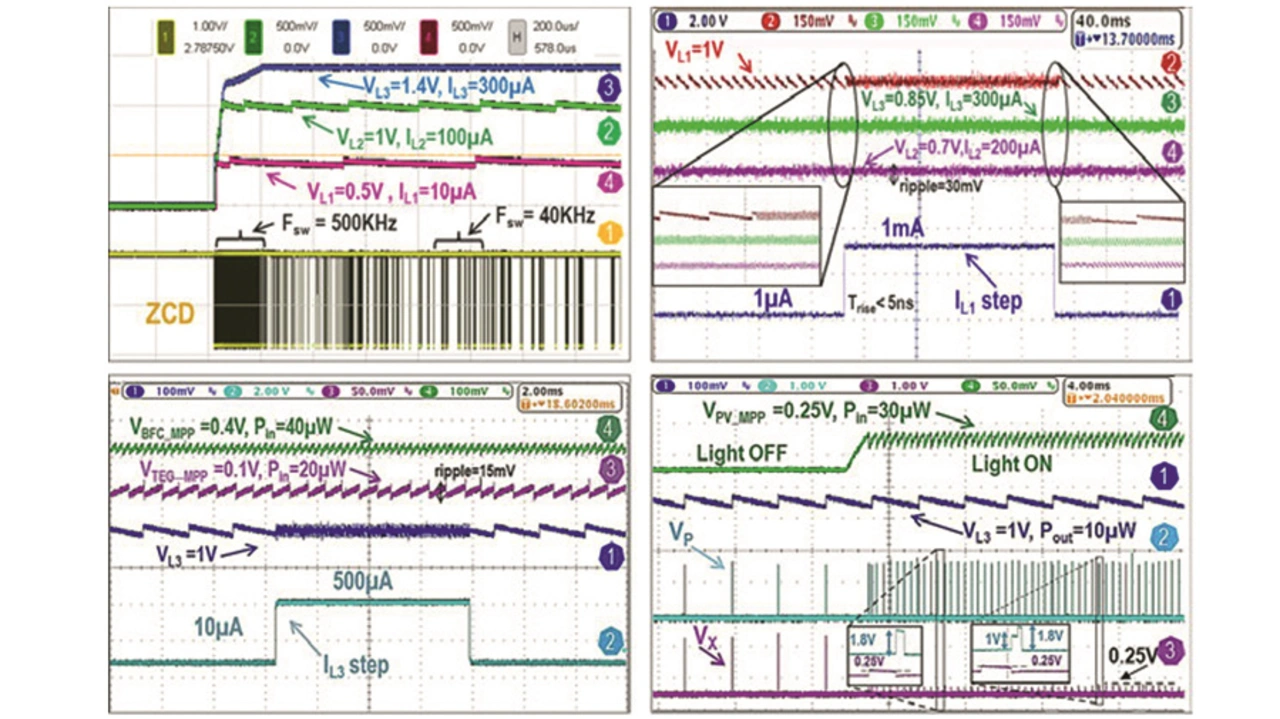 Dynamische Messungen zeigen, dass der Chip drei unabhängige Lasten bei unterschiedlichen Spannungen mit dynamischer Einschaltdauer und PFM effektiv regeln kann – auch während der Anlaufphase (Bild 5, oben links) oder während eines Lastsprungs (Bild 5, oben rechts), alle mit vernachlässigbarem Spannungseinbruch und einer Restwelligkeit von unter 30 mV. Die gemessenen Lastsprünge (Bild 5, unten links) und Sprünge bei den Harvesting-Quellen (Bild 5, unten rechts) zeigen, dass der MISIMO-Chip mehrere Eingangsquellen (maximal 15 mV Welligkeit für MPPT-Zwecke) und mehrere Ausgangslasten mit einer Topologie gleichzeitig mit nur einer einzigen Induktivität ohne Cross-Regulation-Fehler regeln kann.