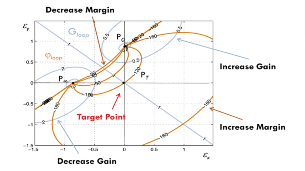 Wie Bild 3 zu entnehmen ist, variiert der Controller die Werte des PID-Filters so lange, bis εx und εy null sind. Dies verlagert die Kompensation zum Zielpunkt, an dem die gewünschte Bandbreite und die angestrebte Phasenreserve vorliegen. In Bild 3 befindet sich der Zielpunkt dort, wo die blaue Gerade gleich 1 ist, weil die angestrebte Bandbreite dividiert durch die gemessene Bandbreite eins ergibt, und die orange Kurve -120 beträgt (in diesem Fall die Differenz zwischen gewünschter und gemessener Phasenreserve). Entscheidend an diesem Prozess ist, dass der mathematische Ansatz das Konvergieren der PID-Parameter als korrekt bestätigt.