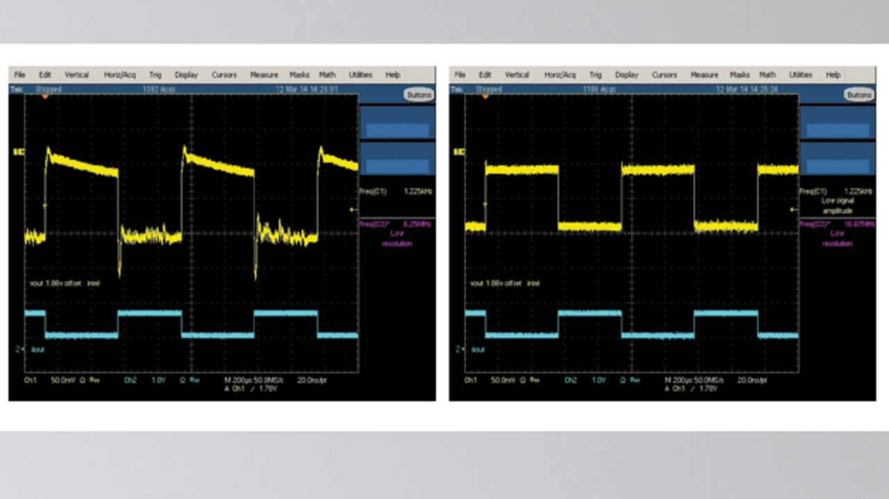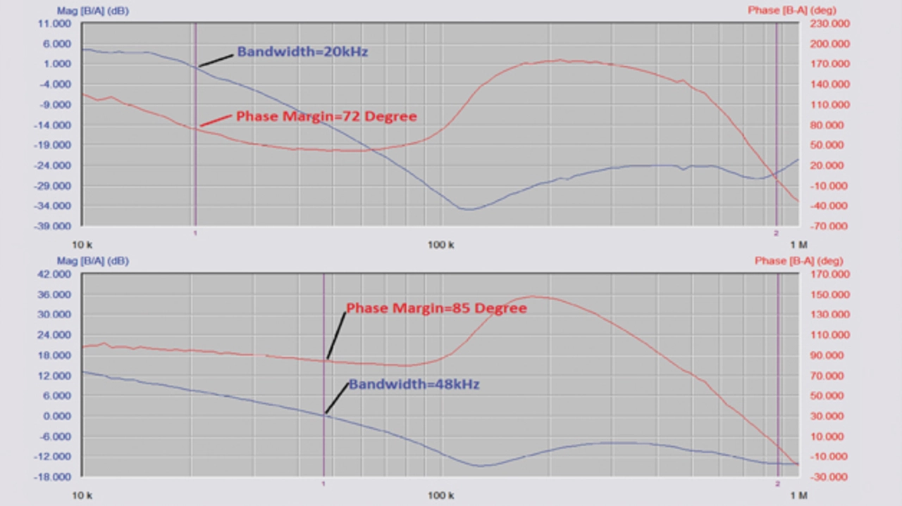 Nachdem die Anweisung zum Abstimmen gegeben wurde, dauert es nur wenige Millisekunden, bis der Algorithmus die optimalen Werte für das PID-Filter gefunden hat. Bild 5 zeigt die Bode-Diagramme zu den Messungen aus Bild 4. Der Baustein wurde zunächst mit zu wenig Bandbreite konfiguriert (20 kHz im vorliegenden Beispiel). Das Autotuning korrigiert die Werte des PID-Filters jedoch so, dass er die optimale Einstellung erreicht (in diesem Fall 48 kHz, wodurch die Phasenreserve noch großzügiger wird).