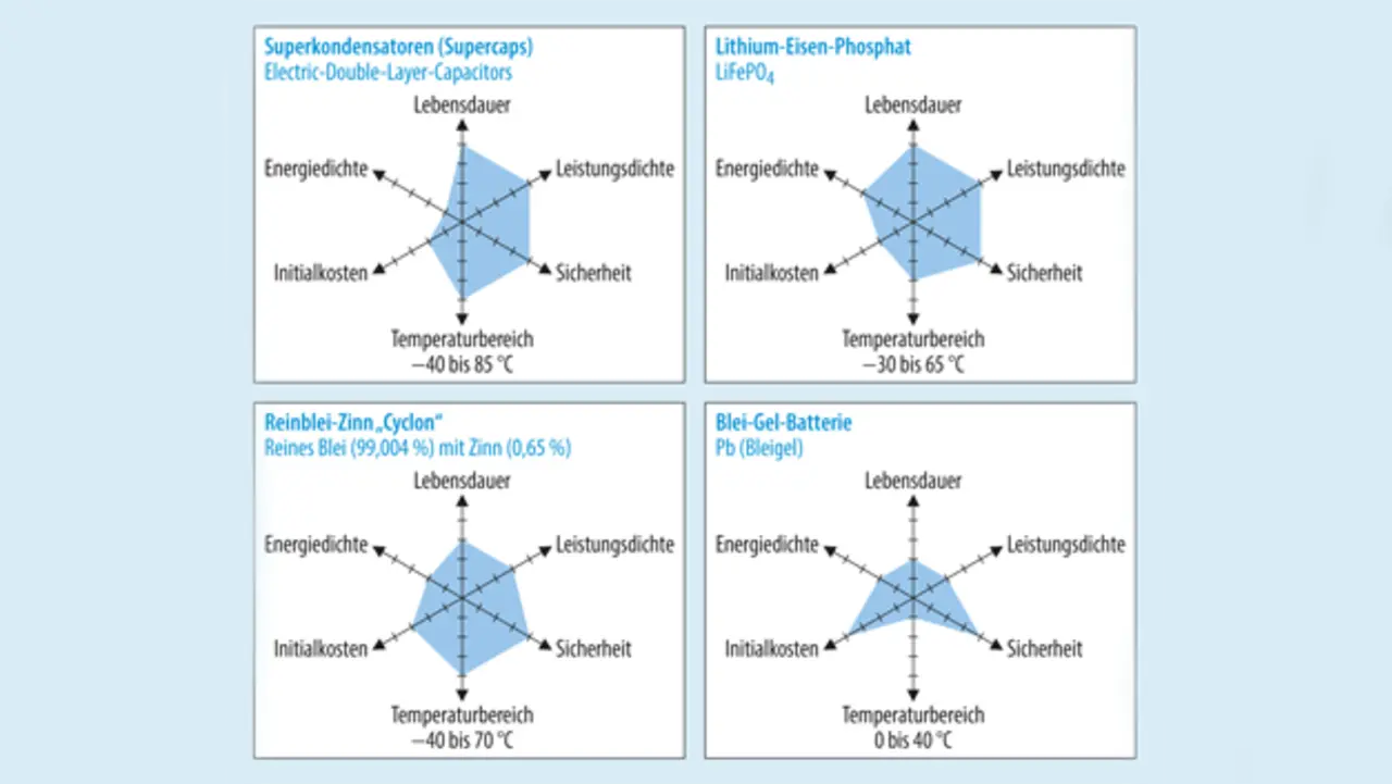 Muss der Energiespeicher nah an der Maschine oder in einer wärmeren Umgebung platziert werden und damit höhere Einsatztemperaturen verkraften, eignen sich LiFePO4-Batterien oder wartungsfreie Superkondensatoren besser. Bei sehr niedrigen oder hohen Temperaturen und entsprechend großem Energiebedarf bieten sich schließlich Reinblei-Zinn-Zellen als besonders robuste und langlebige Energiespeicher an.