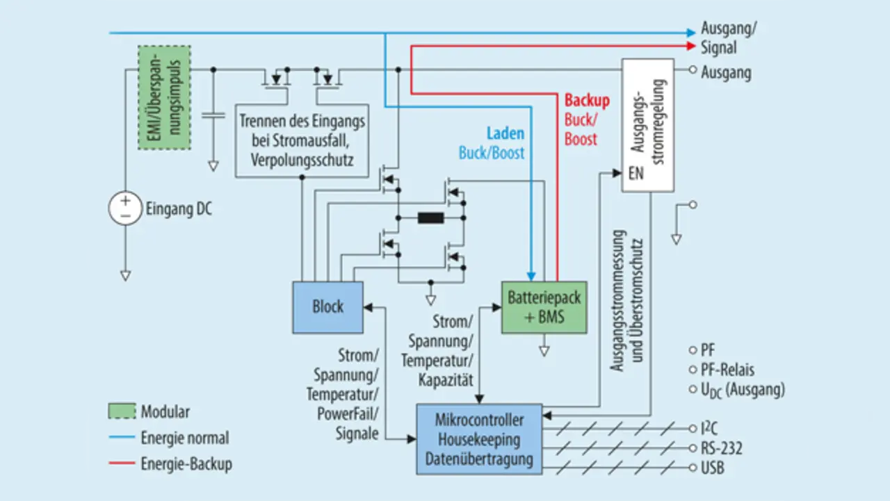 Unterschreitet die Eingangsspannung den unteren Schwellwert aufgrund starker Spannungsschwankungen oder eines kompletten Stromausfalls, trennt ein MOSFET den Eingang ab und der DC-Ausgang bzw. die angeschlossene Last wird aus dem Energiespeicher heraus versorgt. Der Wechsel vom Netz- in den Back-up-USV-Betrieb erfolgt innerhalb weniger Mikrosekunden.
