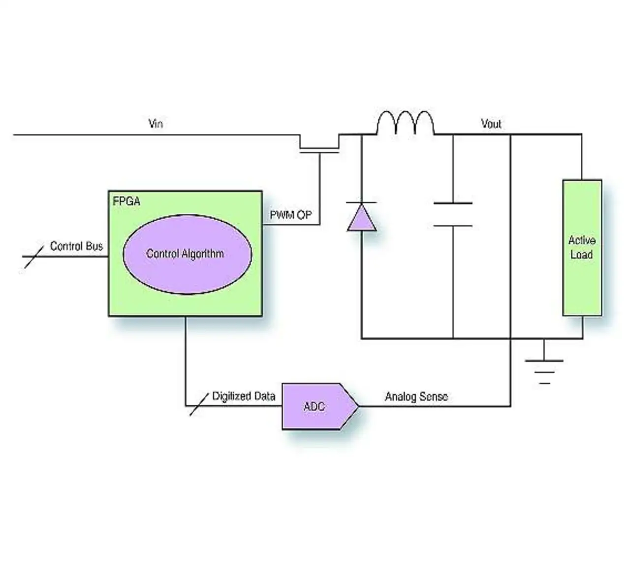 Ein FPGA-basiertes System benötigt die prinzipiell gleichen Elemente wie sein analoges Gegenstück − PWM-Erzeugung, Fehlerberechnung und Steueralgorithmus für die Pulsbreitenmodulation. Doch bietet das FPGA dabei eine Reihe entscheidender Vorteile. Die meisten davon ergeben sich einfach aus der Arbeitsweise des Bausteins, der keine speziellen Erfordernisse an die Schaltungsauslegung stellt, mit der Ausnahme, dass etwas HDL-Kodierung anfällt. Allerdings benötigt diese Technik einen A/D-Wandler, um die momentan vorliegende Ausgangsspannung auf das FPGA zurückzuführen. Damit bestimmt der Steueralgorithmus die jeweils erforderliche Regelung am PWM-Ausgang.
