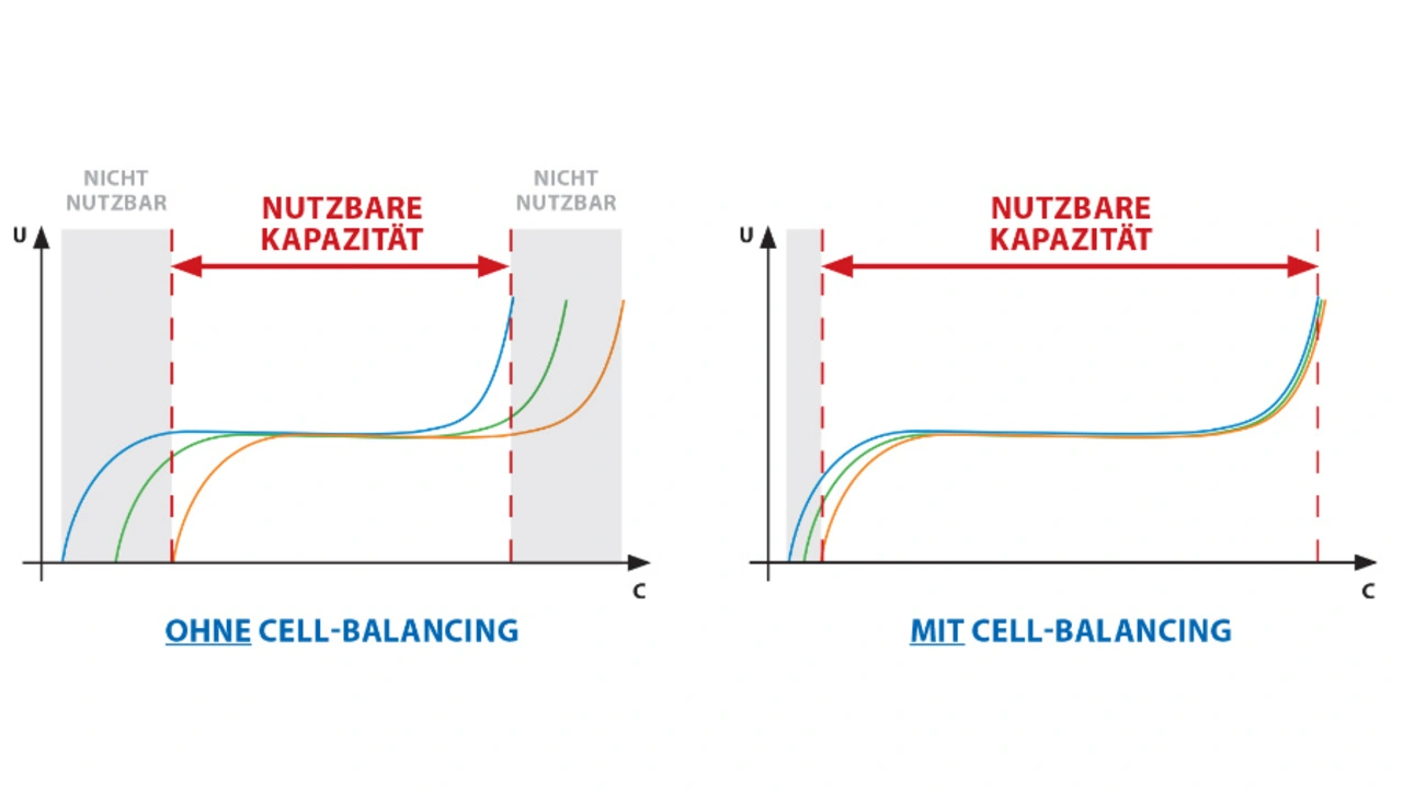 Das Cell-Balancing (aktiv oder passiv) gleicht diese Unterschiede zwischen den einzelnen Akkuzellen im Verbund durch entsprechende Beschaltung aus und sorgt dafür, dass alle Zellen ausgewogen und gleichmäßig geladen werden. Dadurch bleibt die volle Kapazität des Energiespeichers nutzbar, und die Zyklenzahl und die Lebensdauer steigen.