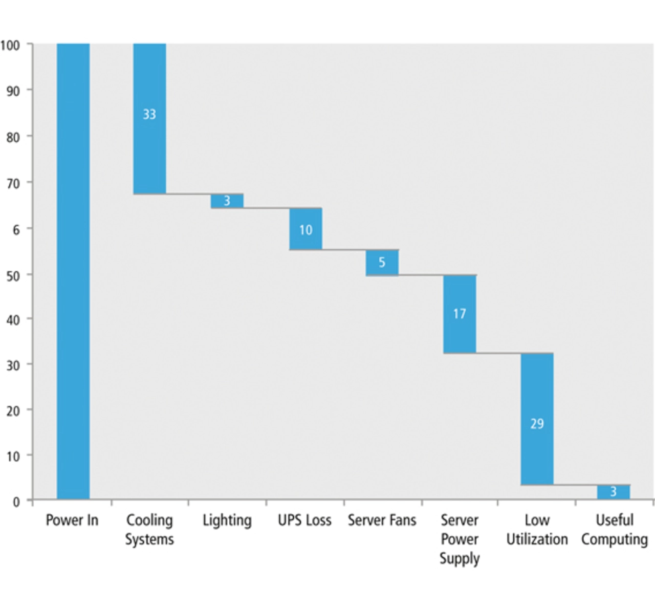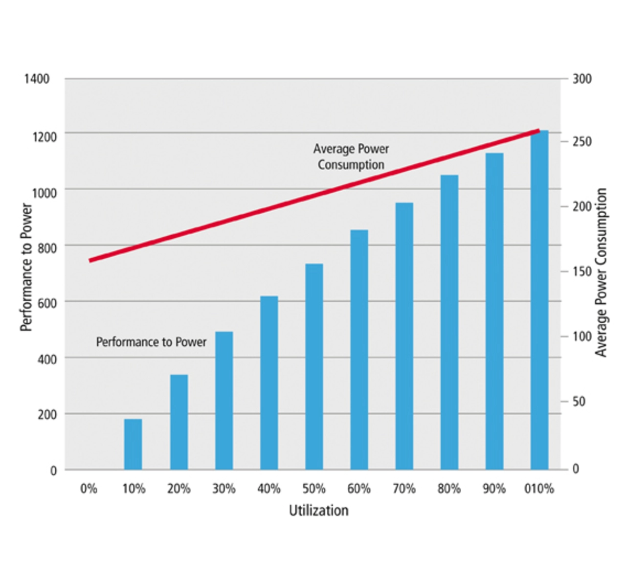Das Wasserfall-Diagramm in Bild 2 gewährt einen Einblick in Bereiche, wo Energieeinsparungen möglich sind. Diese lassen sich realisieren, wenn die Datenzentren auf eine höhere Auslastung ausgerichtet sind – mehr Rechenaktivität bei gleichem Stromverbrauch. Dasselbe gilt auch, wenn das Datenzentrum für eine bessere Energieeffizienz im Leerlauf entworfen wurde. Darüber hinaus können diese Einsparungsmethoden auch die Kosten für die Systemkühlung reduzieren. Einen interessanten Punkt verdeutlicht auch die Studie von Google. Diese ergab, dass Server nie wirklich im Leerlauf arbeiten, sondern die meiste Zeit im Bereich einer niedrigen Auslastung von 10% bis 50%.