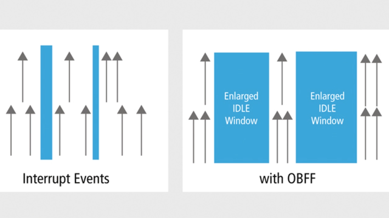 Über OBFF kann der Host Informationen über den Systemzustand mit den Geräten austauschen, sodass diese ihre Aktivität planen und die Zeit im stromsparenden Zustand optimieren können. In einer typischen Plattform ist den PCIe-Geräten im System nicht bekannt, in welchem Leistungszustand die Hauptressourcen jeweils sind. Deshalb kann der Entwickler CPU, Root-Komplex und Speicherkomponenten nicht optimal verwalten, weil die Geräte-Interrupts asynchron sind und so das Idle-Fenster fragmentieren. Mit OBFF (Bild 5) erhalten die Geräte Leistungsmanagement-Hinweise, sodass sie Anforderungsmuster optimieren können. Zudem ist ihnen bekannt, wann sie das Hauptsystem unterbrechen können. Dadurch kann das System das Idle-Fenster erweitern und länger in einem Low-Power-Zustand bleiben. OBFF kann mit einer erweiterten Bedeutung des »WAKE#«-Signals oder mit einer Nachricht implementiert werden.