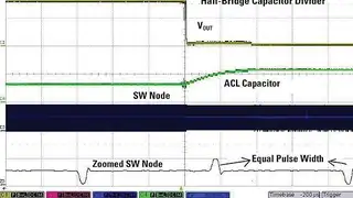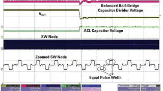 Aus den Bildern 5 und 6 ist klar abzulesen, dass die Spannung am Mittenpunkt des kapazitiven Spannungsteilers sowohl bei sanft als auch abrupt einsetzender Überlast austariert bleibt. In beiden Kurven ist zu sehen, dass diese Spannung vor dem Aufladen des ACL-Kondensators zu driften beginnt, aber sofort wieder ins Gleichgewicht kommt, sobald die ACL-Schaltung anspringt. Die Vergrößerung zeigt außerdem klar, dass die ACL-Schaltung für gleiche Impulsbreiten in beiden Phasen der Halbbrücke sorgt. Dass der ACL-Kondensator bei sanft einsetzender Überlast schneller aufgeladen wird als bei einem abrupten Kurzschluss, liegt an den unterschiedlichen Pulsweiten in beiden Situationen. In Bild 6 erkennt man auch die Frequency-Foldback-Funktion, wenn man den vergrößerten Signalverlauf am Schaltknoten genau betrachtet.