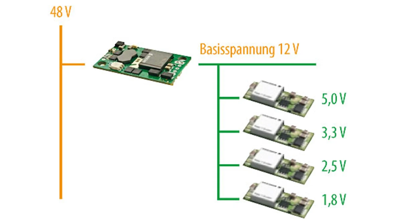 Das Stromversorgungskonzept, das heute im IKT-Markt zunehmend zum Einsatz kommt, ist die Intermediate Bus Architecture (IBA), die 2003 standardisiert wurde. Das IBA-Modell unterscheidet sich von der Distributed Power Architecture (DPA), die aus mehreren isolierten DC/DC-Wandlern auf jedem Board besteht, welche die -48-V(DC)-Spannung auf geeignete Werte für die Lastschaltkreise herunterwandelten. Je nach Bedarf wurden einfach weitere Regler in Daisy-Chain-Anordnung hinzugefügt. Während die DPA sich immer noch für kleine Anwendungen eignet, die über 24-V(DC)-Quellen versorgt werden und in einigen Industriezweigen noch beliebt sind, würden sich damit bei einer effizienten und direkten Abwärtswandlung von -48 V auf Logik-Versorgungsspannungen, wie zum Beispiel 3,3 V oder weniger, Probleme ergeben. Isolierte DC/DC-Wandler sind zudem teurer und weniger effizient als nicht isolierte Wandler.