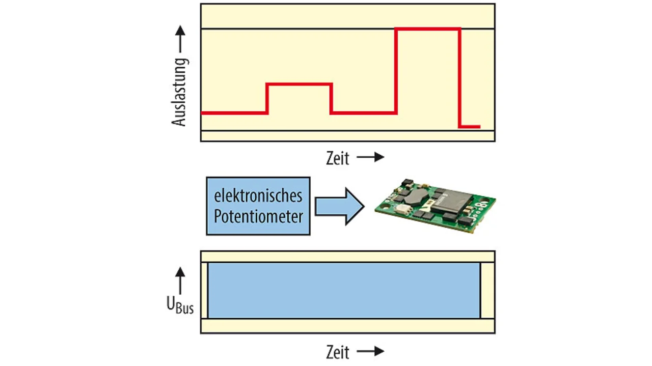 Das Konzept zur Justierung der Intermediate-Busspannung an die Lastanforderungen wurde erstmals Mitte der 1990er Jahre erprobt. Dabei kam ein elektronisches Potenziometer zur Steuerung des analogen DC/DC-Wandlers über seinen Ausgangsspannungs-Justieranschluss zum Einsatz (Bild 2). Diese Technik wurde jedoch nie kommerziell genutzt, da die genaue Optimierung der Busspannung zu komplex ist. Sie war aber der Auslöser für weitere Forschungsvorhaben im Bereich Digital Power.
