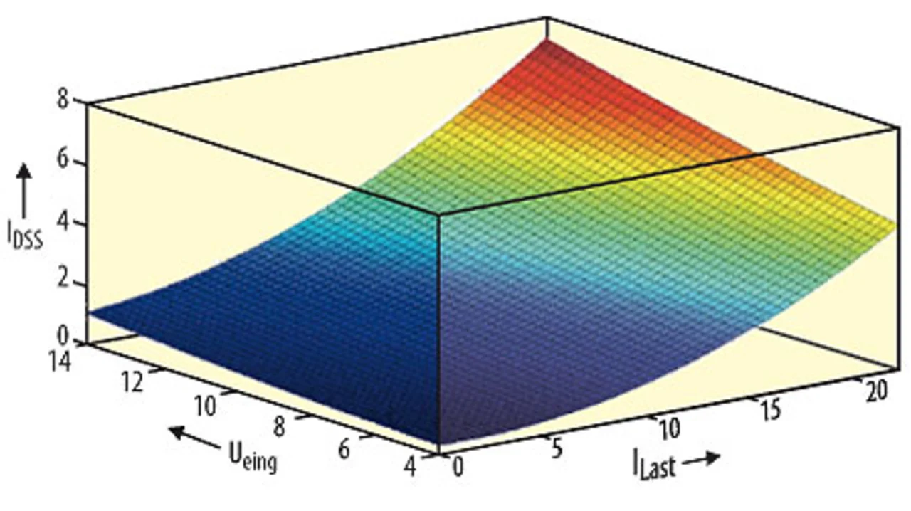 Vor der Erwägung, DBV einzusetzen, steht die Überprüfung des möglichen Energieeinsparpotenzials. Dabei wird ein Modell eines gängigen Systems erstellt und geprüft, ob es genauso präzise und zuverlässig ist wie eine reale Anwendung. Ausgangspunkt ist die Funktion jedes IBC und POL in einem System über den Bereich der möglichen Eingangsspannungen und Ausgangsströme, wie sie in der Endanwendung auftreten können. Dann werden die Leistungsverluste schrittweise aufgezeichnet. Der Ausdruck der jeweiligen Parameter erzeugt eine dreidimensionale Ansicht über den Wirkungsgrad einer jeden Baugruppe hinsichtlich des gewählten Messbereichs (Bild 3).