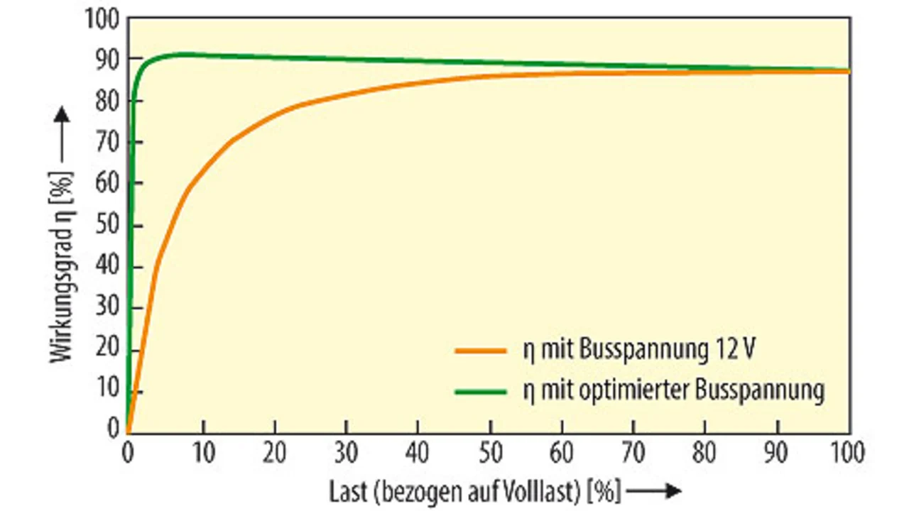 Ein Testsystem, bestehend aus -einem fortschrittlichen IBC, der zwei 20-A- und vier 40-A-Digital-POLs versorgt, veranschaulicht die Steigerung des Wirkungsgrades, die sich durch die dynamische Anpassung des Wertes der Intermediate-Busspannung im Vergleich zu einem festem 12-V(DC)-Wert ergibt. Die Verbesserungen werden je nach durchschnittlicher Last auf drei bis zehn Prozent geschätzt (Bild 4).