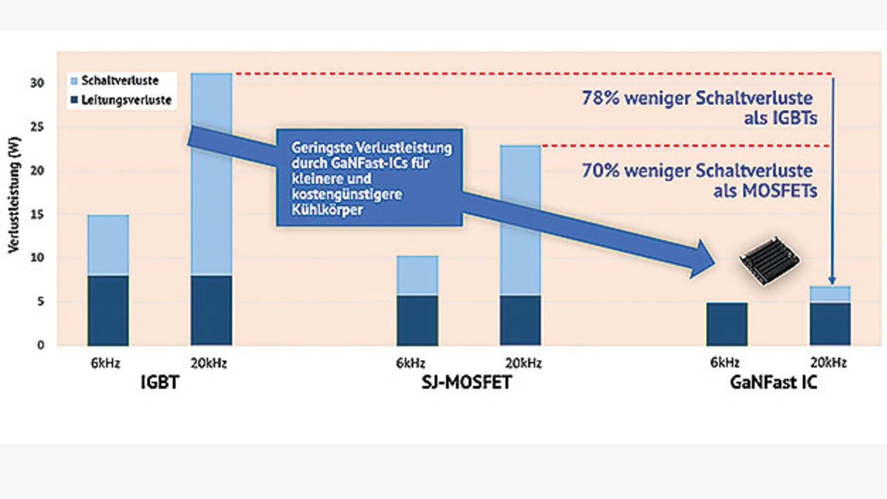 Die Kombination aus sehr niedrigen Schaltverlusten und null Speicherladung ermöglicht einen neuen Freiheitsgrad bei Schaltfrequenzen für drehzahlvariable Antriebe. Motorantriebe wurden bisher auf eine niedrige Schaltfrequenz ausgelegt, um Schaltverluste zu reduzieren. Durch den Einsatz von GaN lassen sich die Schaltfrequenzen nun deutlich von unter 16 kHz auf über 65 kHz erhöhen, was zahlreiche Vorteile mit sich bringt. Erstens kann die Induktivität der Motorwicklung reduziert werden, was die Motorgröße verkleinert und den Wirkungsgrad aufgrund der geringeren ohmschen und HF-Verluste in den Wicklungen erhöht.