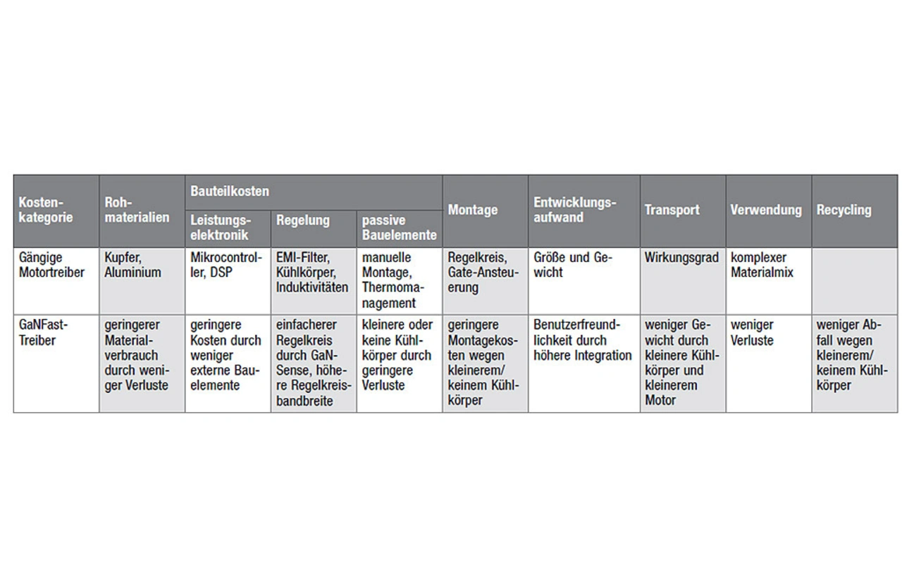 Galliumnitrid (GaN) ist ein Halbleiter mit großer Bandlücke (WBG, Wide Bandgap), der im Vergleich zu Silizium-Pendants überlegene Eigenschaften bietet, unter anderem bis zu 20-mal schneller schaltet und die Leistungsdichte um mehr als das Dreifache erhöht. Der Einsatz von GaN-Leistungs-ICs in einem Antriebssystem für PFC- und Wechselrichterstufen senkt die Verlustleistung. Dies kann die Gesamtbetriebskosten (TCO, Total Cost of Ownership) der gesamten Lieferkette für Motorantriebe senken (Tabelle 1).