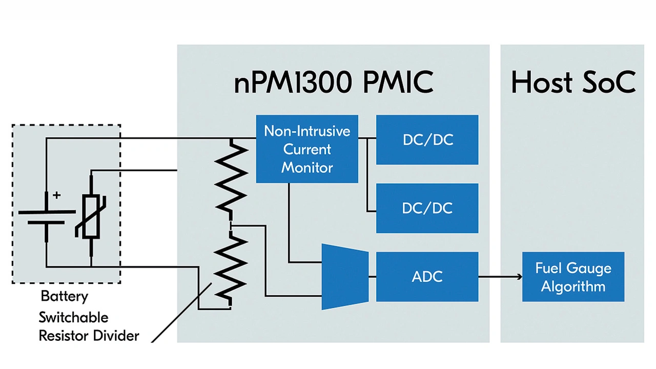 Entscheidend für die Genauigkeit und den geringen Stromverbrauch der Ladezustandsanzeige von Nordic über einen weiten Temperaturbereich ist der Softwarealgorithmus, den der Host-Prozessor steuert. Der Prozessor verwendet Informationen wie den Strom, der aus der Batterie fließt, die Spannung an den Batteriepolen, die Systemspannung und einen Thermistorwert der Batterietemperatur (Bild 2).