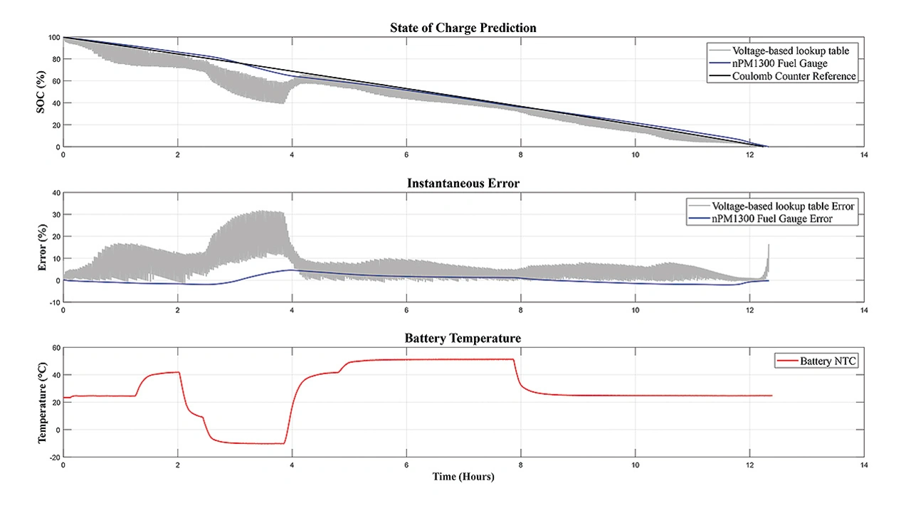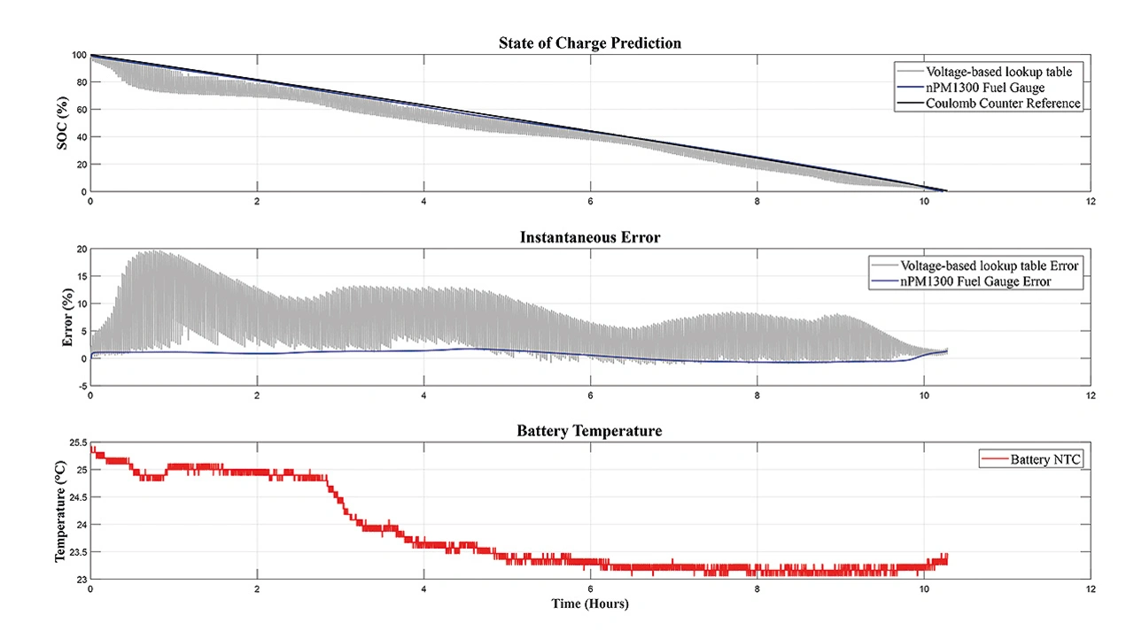 Ladezustandsanzeige des nPM1300 im Vergleich zum Coulomb-Zähler einen maximalen Fehler von nur 4 Prozent aufwies (Bild 4).