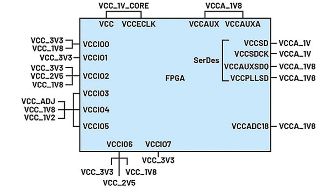 Auf dem CertusPro-NX-Evaluierungs-Board werden die meisten Regler direkt von einer externen 12-V-Stromversorgung gespeist. Jeder VCCIO-Pin des FPGAs hat seine standardmäßigen, aber variablen Stromversorgungspegel, die je nach Anwenderpräferenz sowie entsprechend der Applikation ausgewählt werden. Bild 1 zeigt die nutzbaren Spannungsschienen, die mit den spezifischen VCCIO-Pins des FPGAs verbunden sind.