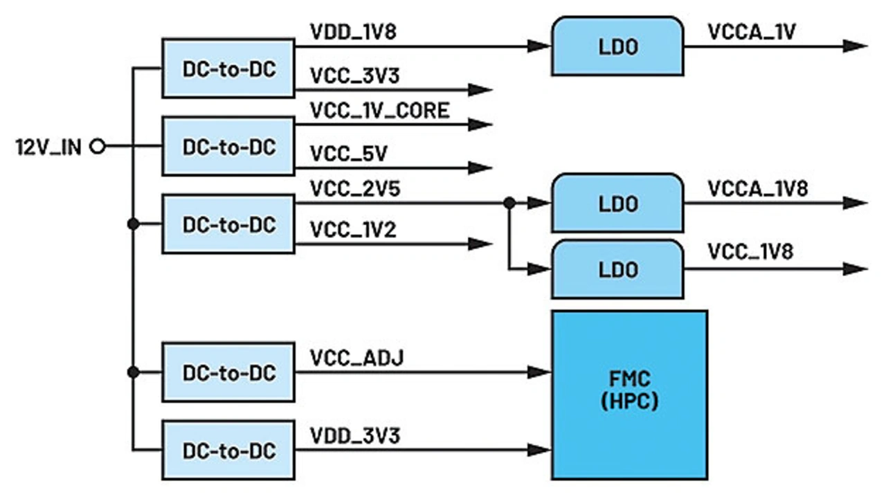 Jeder von den VCCIO-Pins genutzte Spannungspegel wird von jeweils einem Spannungsregler auf dem Board generiert. Die Eingangsspannung wird von einer externen 12-V-Quelle gespeist. Bild 2 zeigt die verschiedenen Ausgangsspannungen, die von den Reglern auf dem Board direkt aus der 12-V-Eingangsspannung generiert werden. Für eine Nachregelung werden bei Bedarf LDO-Regler eingesetzt, um eine niedrigere Spannung zu erzeugen und gleichzeitig das Rauschen am Ausgang zu reduzieren.