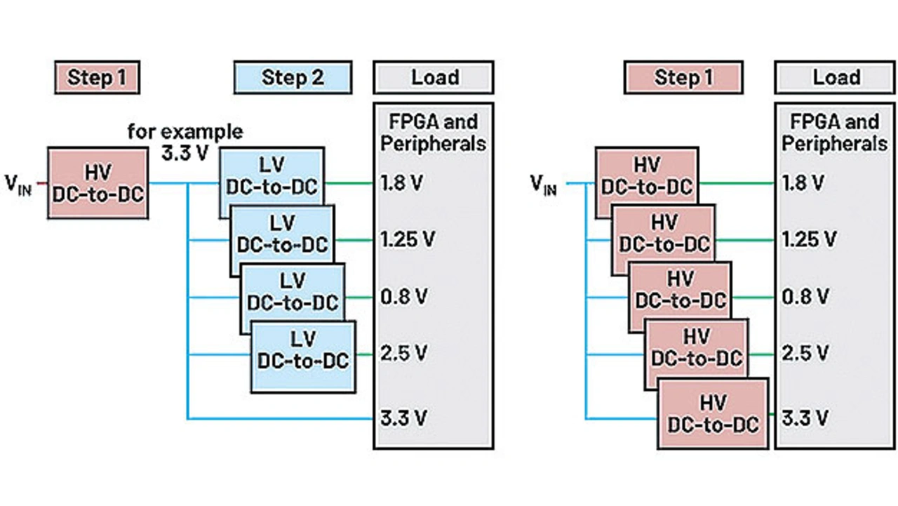 Benötigt der Anwender einen größeren Eingangsspannungsbereich oder eine höhere Eingangsspannung (z. B. 24 V), kann man auf eine zweistufige Wandlung übergehen. Damit kann man zuerst einen Zwischenspannungspegel von z. B. 5,0 V oder 3,3 V erzeugen, der dann genutzt wird, um die folgenden Regler zu versorgen, welche die gewünschten niedrigeren Spannungen generieren, wie in Bild 3 dargestellt.