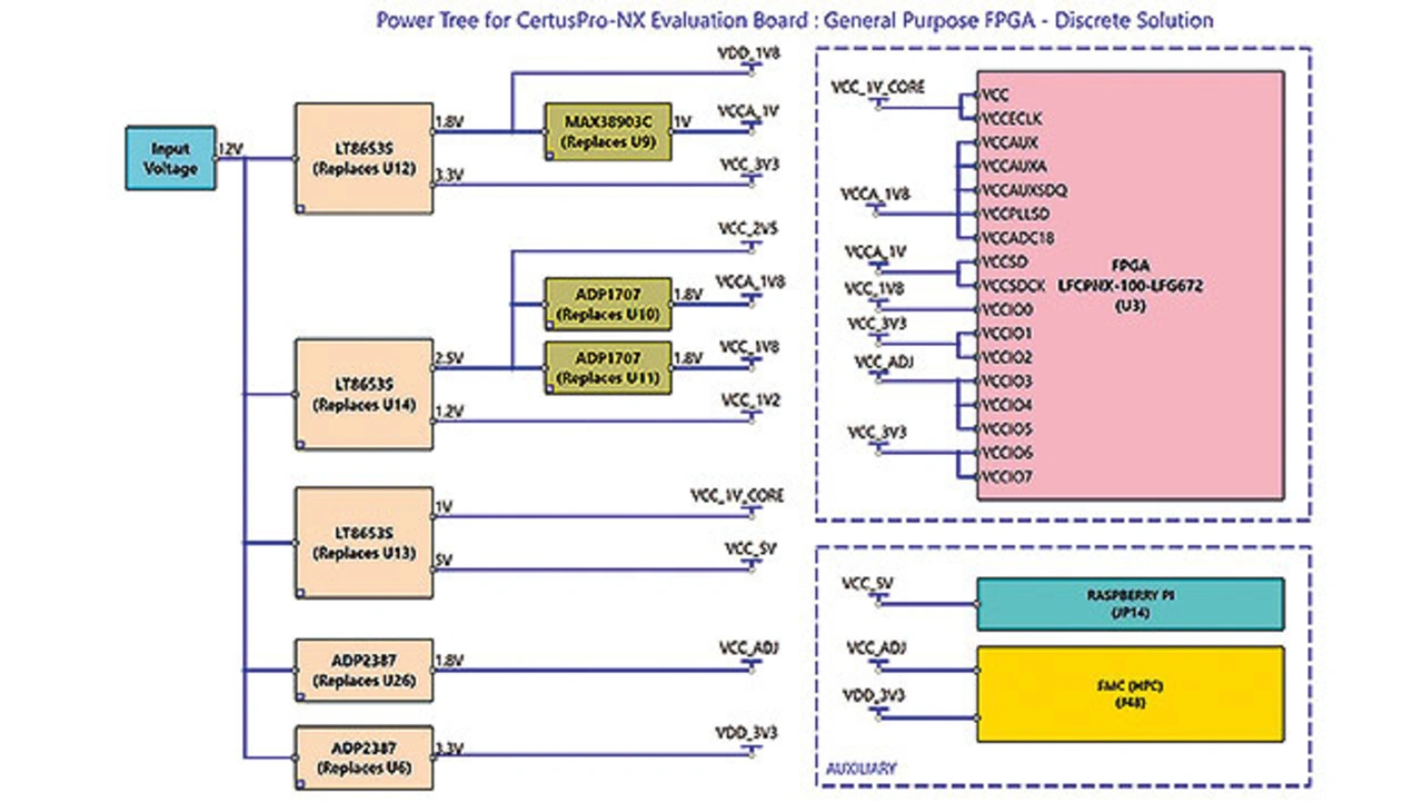 Der diskrete Stromversorgungsansatz bietet die beste individuelle Leistung für die einzelnen DC/DC-Regler einer jeden Spannungsschiene, da sie es den Entwicklern erlaubt, die externen Schaltungskomponenten für die jeweilige Anwendung zu optimieren. Die aktualisierte Empfehlung für die diskrete Stromversorgung bietet signifikante Leistungsverbesserungen gegenüber der bestehenden Stromversorgung auf dem Standard-FPGA-Evaluierungsboard. Alle DC/DC-Wandler nutzen interne Schalter, um den Wirkungsgrad zu maximieren und ermöglichen gleichzeitig ein kompaktes Design und ein hervorragendes EMI-Verhalten. Bild 4 zeigt die diskrete Stromversorgungsstruktur für das CertusPro-NX-Evaluierungs-Board.