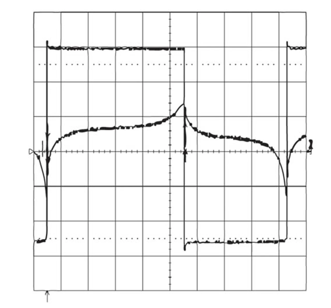 Der Fluxgate-Sensor wird mit dem ASIC zu einem Oszillator verschaltet, der bei einer Frequenz von mehreren 100 kHz schwingt. In jeder Halbwelle wird der Fluxgate-Sensor in die Sättigung getrieben. Ein DC-Magnetfluss im Fluxgate-Kern führt dazu, dass sich das Tastverhältnis der Steuerspannung (Bild 4) ändert, und diese Änderung ermöglicht einen Rückschluss auf den vom Fehlerstrom verursachten Magnetfluss.