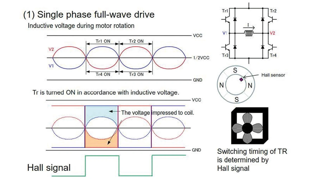 Im Gegensatz zu einem typischen bürstenbehafteten Gleichstrommotor wird ein BLDC-Motorsteuerungssystem als Inverter (Umrichter) bezeichnet. Es besteht aus einer Leistungsstufe zur Ansteuerung des Motors, Messverstärkern zum Erfassen der Gegen-EMK- Signale (elektromotorische Kraft) für den sensorlosen Betrieb, einem Encoder oder Hall-Sensoren für einen sensorgesteuerten Betrieb und einem MCU-basierten Controller. Der Controller wandelt die rückgekoppelten Informationen über Drehzahl und Position in entsprechende PWM-Signale (Pulsweitenmodulation), um den Motor dynamisch anzusteuern.