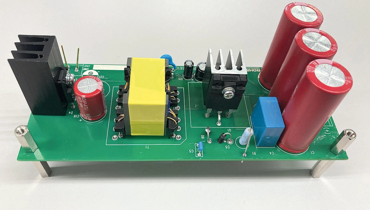 Zur Demonstration der Leistungsfähigkeit des ROHM-PWM-Controllers BD28C57HFJ wurde eine Evaluierungsplatine entwickelt (Bild 4). Als Flyback-Schalter wurde der 1700-V-SiC- MOSFET SCT2H12NZ von Rohm mit einem RDS(on) von 1,15 Ω in einem TO-3PFM-Gehäuse verwendet. Im Vergleich zu einem Standard-1500-V-Silizium-MOSFET hat Rohms SiC-MOSFET einen um 87 Prozent reduzierten RDS(on) und hervorragende Schalteigenschaften.