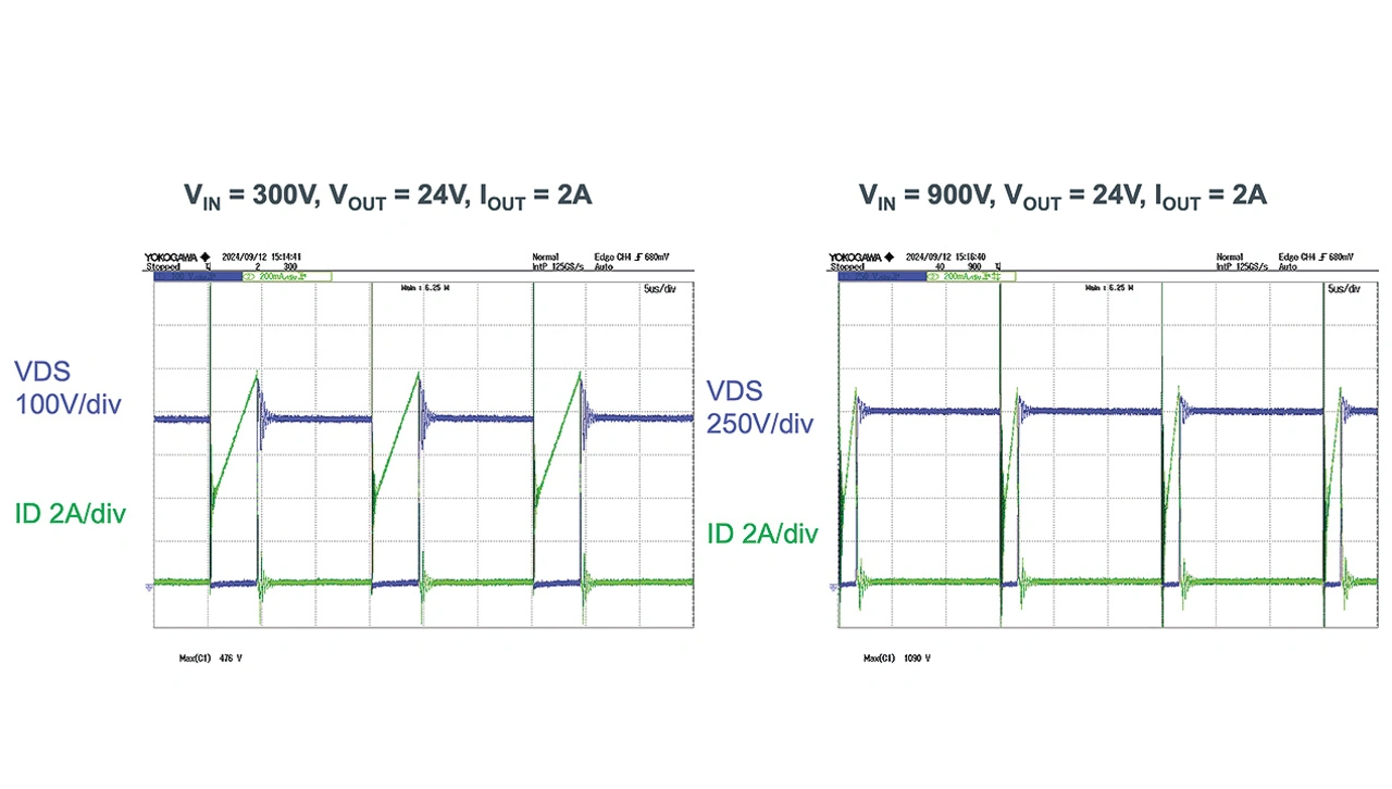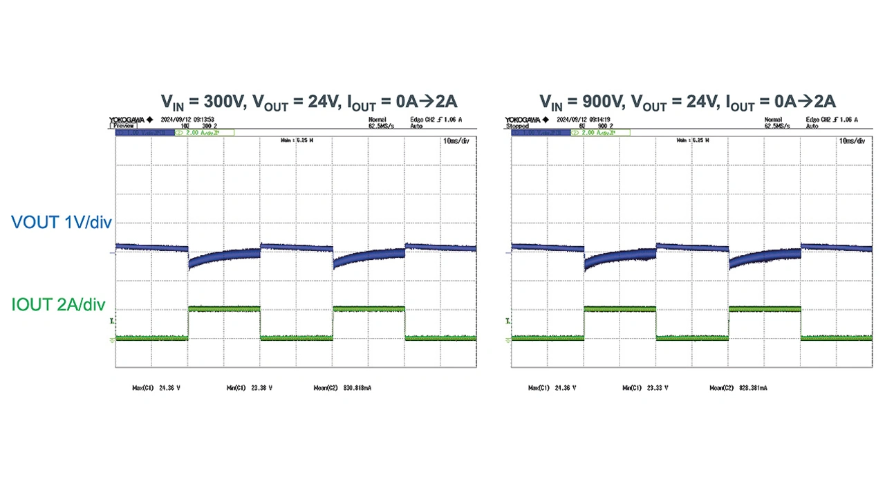 Das Schaltverhalten des MOSFET, das Lastsprungverhalten, der Anlauf und der Wirkungsgrad wurden untersucht. Bild 5 zeigt das Schaltverhalten des MOSFETs bei zwei verschiedenen Eingangsspannungen von 300 und 900 V, einer Ausgangsspannung von 24 V und einem Ausgangsstrom von 2 A. Obwohl die Platine für einen Gleichstromeingang ausgelegt ist, kann sie auch mit dreiphasigem Wechselstrom betrieben werden. In diesem Fall muss der erforderliche Netzgleichrichter jedoch extern implementiert werden. Eine gut durchdachte Snubber-Schaltung und ein geeignetes PCB-Layout sorgen dafür, dass die Spitzenspannung des Schalters beim Abschalten 1090 Vmax beträgt und genügend Spielraum für den 1700-V-SiC-MOSFET bietet.