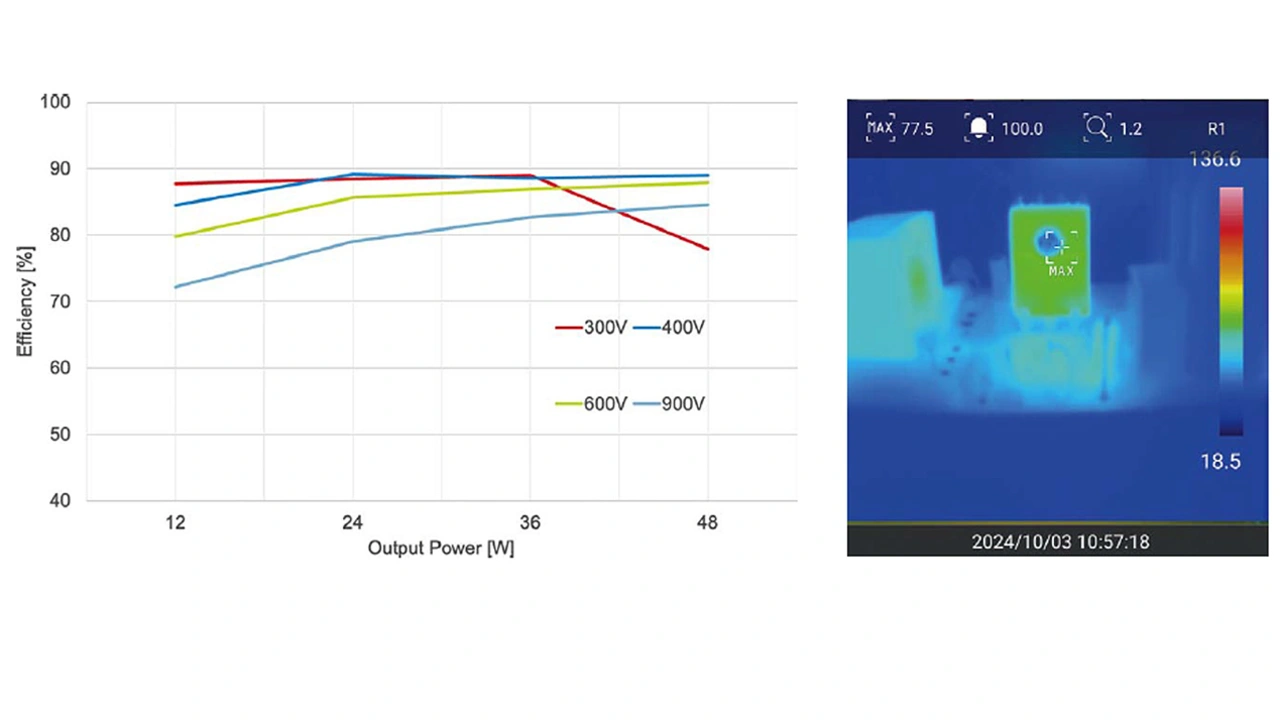 Bild 7 zeigt den Wirkungsgrad des Konverters bei vier verschiedenen Eingangsspannungen und einer Ausgangsleistung von bis zu 48 W. Bei einer Eingangsspannung von 900 V konnte ein Wirkungsgrad von etwa 85 Prozent bei Volllast und ein Spitzenwirkungsgrad von 89 Prozent bei einer Spannung von 400 V erreicht werden.
